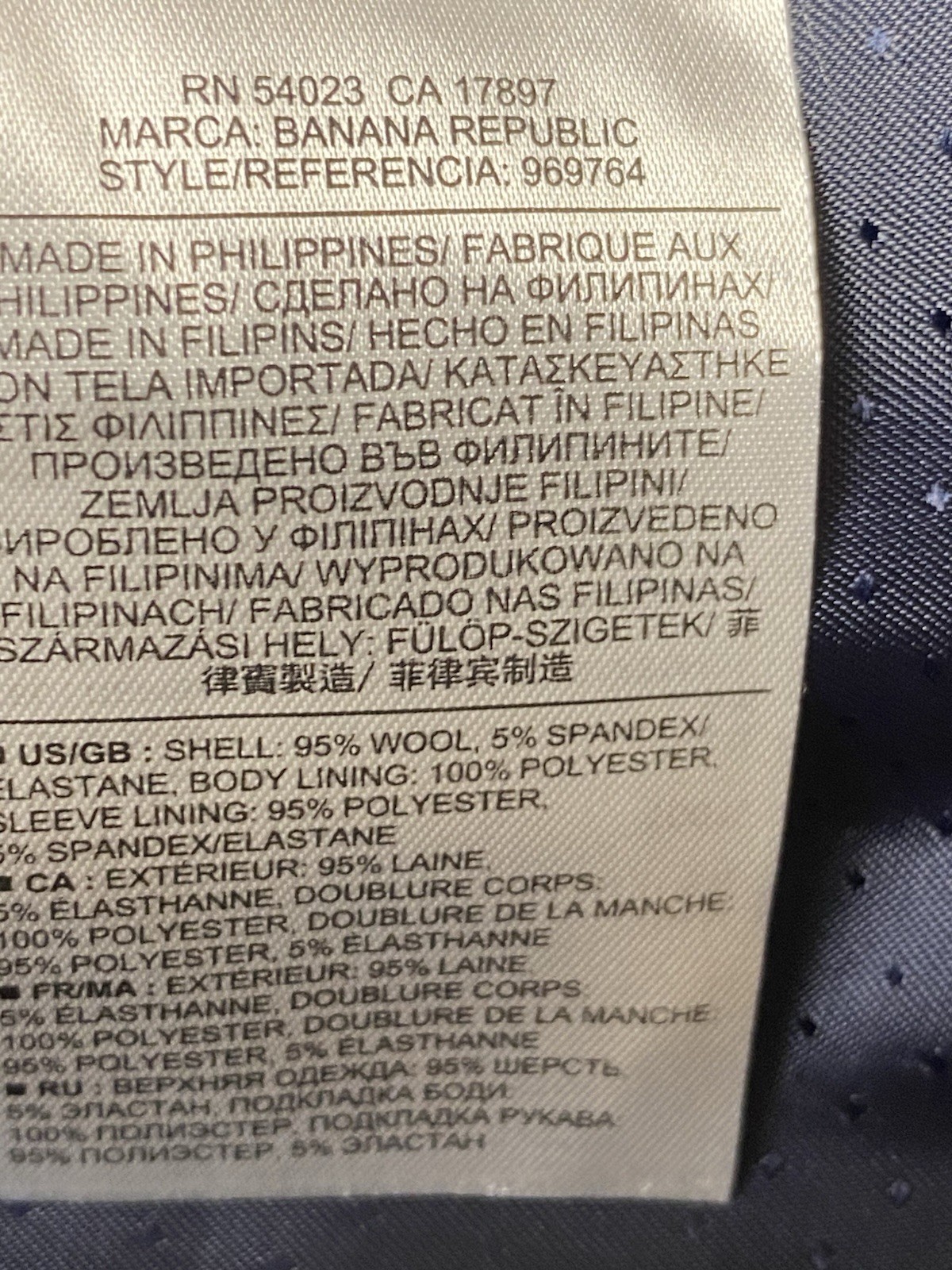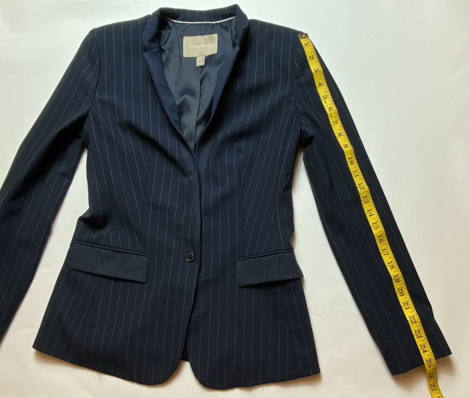 size 6 womens navy blue pinstripe wool single breasted blazer95% Wool, 5% ElastaneDry cleanApproximate measurements when laid flat:Blazer: Armpit to Armpit: 36" (18" across)Waist: 31" (15.5" across) Length: 27" Sleeves: 25"This Banana Republic blazer is in excellent pre-owned condition. No visible flaws. Cleaning instructions not attached. Please look closely at photos for exact condition. Feel free to message me for more photos or details. Ships same or next business day. All items are stored in a smoke and pet-free environment. Thank you for shopping at House of Style By Lisa.