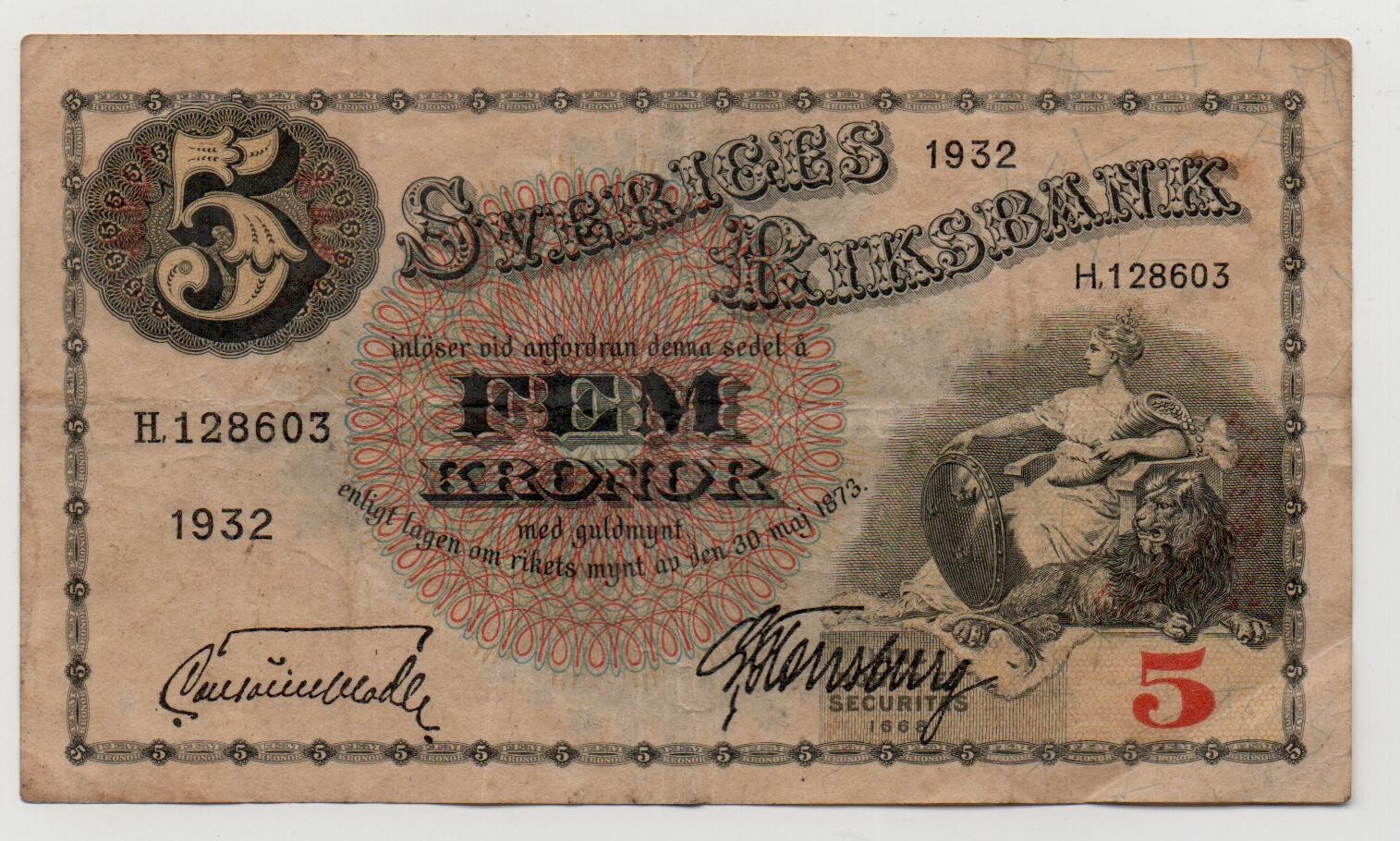 SWEDEN 5 KRONOR 1932 PICK 33 LOOK SCANS Specs