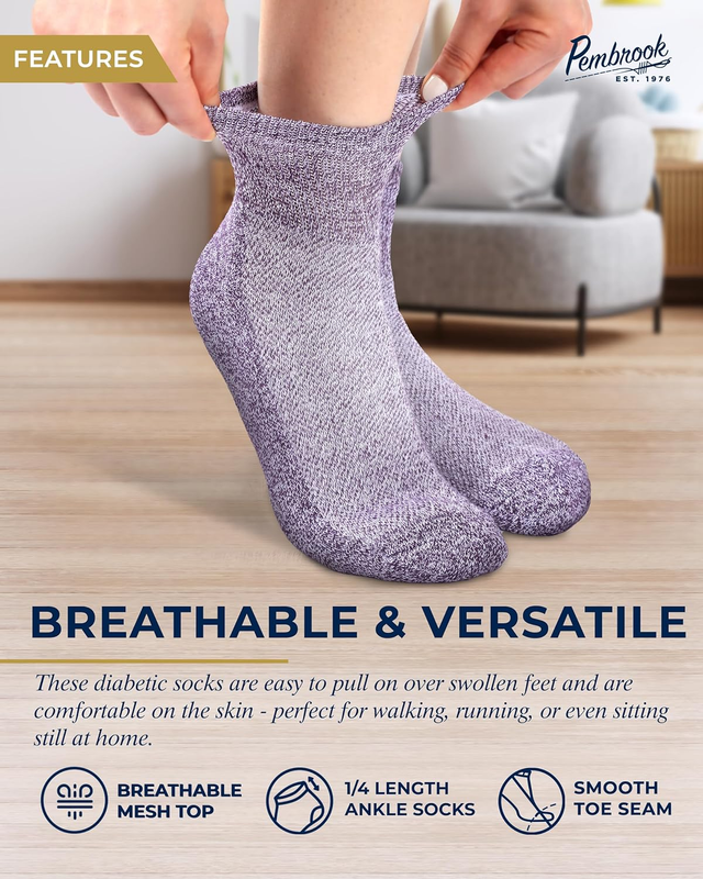 Pembrook Diabetic Ankle Socks - 6 Pairs Wide Fit Comfort for Swollen Feet & Ankles - The Pembrook diabetic socks men and women are lightweight, non binding with a loose top around the ankles to aid poor blood circulation. These diabetic socks women and men are easy to pull on over swollen feet and feel soft and comfortable on the skin. The absolute best pair of diabetic socks for women and men who suffer from edema, diabetes or neuropathy. Product Description 1 Healthy Blood Flow 2 Great Value 3 Comfortable & Breathable Package Dimensions 10.59 x 8.46 x 2.24 inches; 6.56 ounces Shipping Fast shipping is very important for us. We use multiple fulfilment warehouse around the United States. We only ship to the lower 48 States and do not ship to PO Boxes. Our standard US shipping service is $6.99 per order. Your order will be shipped within 2-3 business days upon full payment received. Your order will be delivered within 1-5 business days after the handling time. We reserve the right to cancel any order for any reason at any time. We are not responsible for undeliverable addresses. Returns We offer a 30 days return policy from checkout date. FeedBack Your feedback very important to us, after you get your package and you are satisfied with our service please leave us positive feedback If you have any problem with your order / any questions please before leave any type of feedback For any questions, using eBay contact system Please visit our eBay store to check out other items for sale! Thank you for shopping at our store.