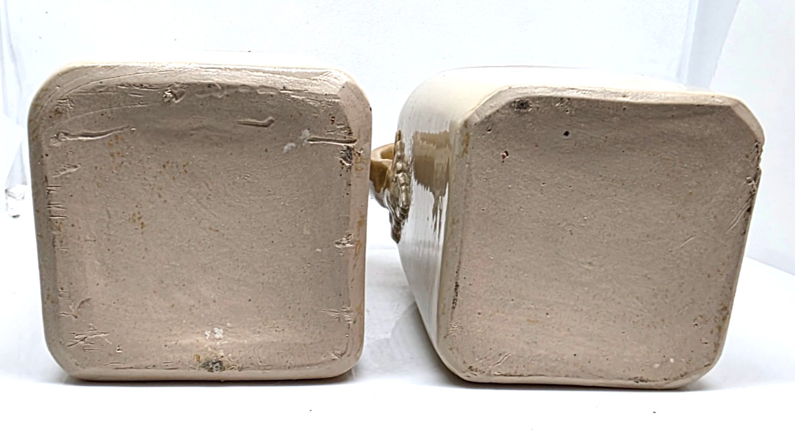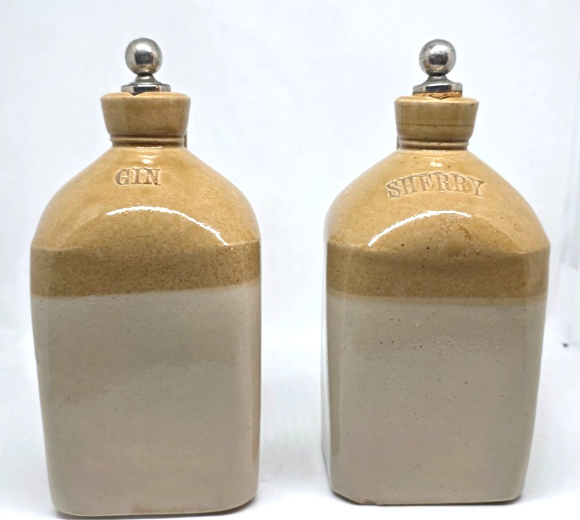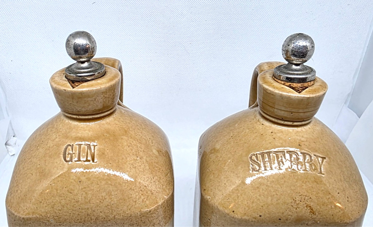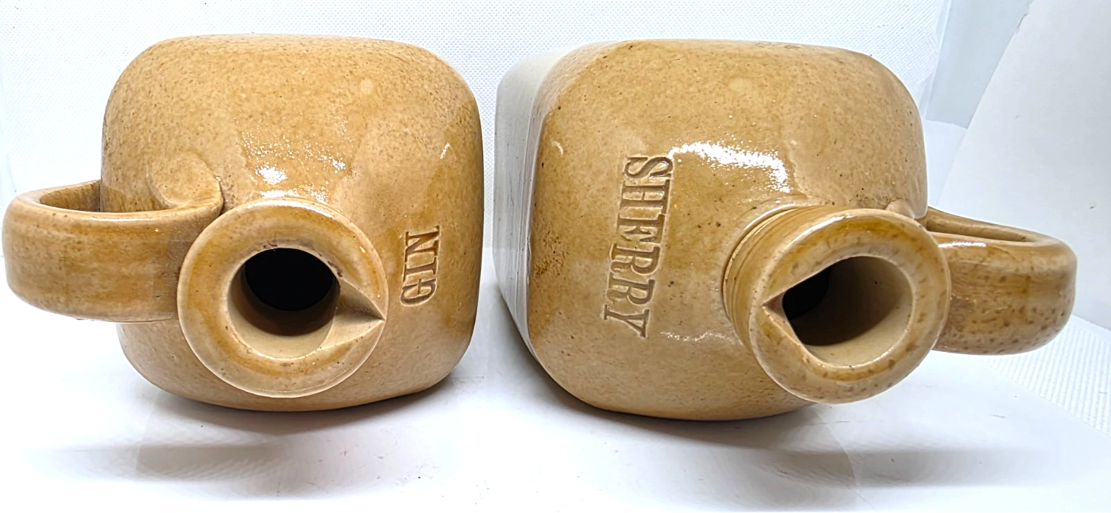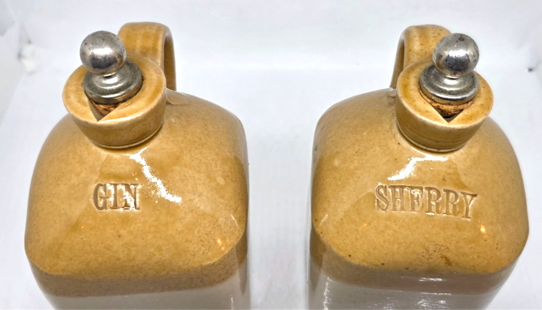 Antique Set of FOUR Liquor Decanters / Crocks / JugsI believe these are from the United Kingdom..StonewareBottles hold about 24 oz of LiquidApproximately 7" High, by 3.5" x 3.5" SquarishIncludes a bottle for: WHISKY, GIN, SHERRY, BRANDYEach bottle has a steel ball cork - one of the corks is in rough shape - see picsBottles are in used condition with general wear / dings to surface from use.Bottles are a bit "primitive" or "rustic" in design.Awesome and RARE set for your BarNote: These are original old, not reproductions.Please note: there are some small splits in the pottery from age and possible from the manufacturing process. See pics - look at the decorative part where the handle meets the bottle, and on the bottoms. I did put water in each of the bottle and there were no leaks, so you will be able to use these for your liquor if desired.Each bottle weighs about 1.75 lb.Please Enlarge Pictures to ViewAll my items are sold as is :) Coin in pictures is to show