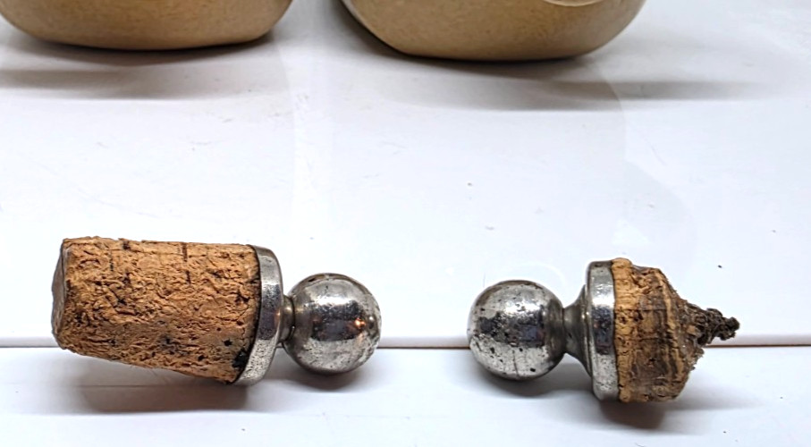 4 Antique Stoneware WHISKEY Jugs / Crocks & Steel Ball Corked Stoppers PRIMITIVE