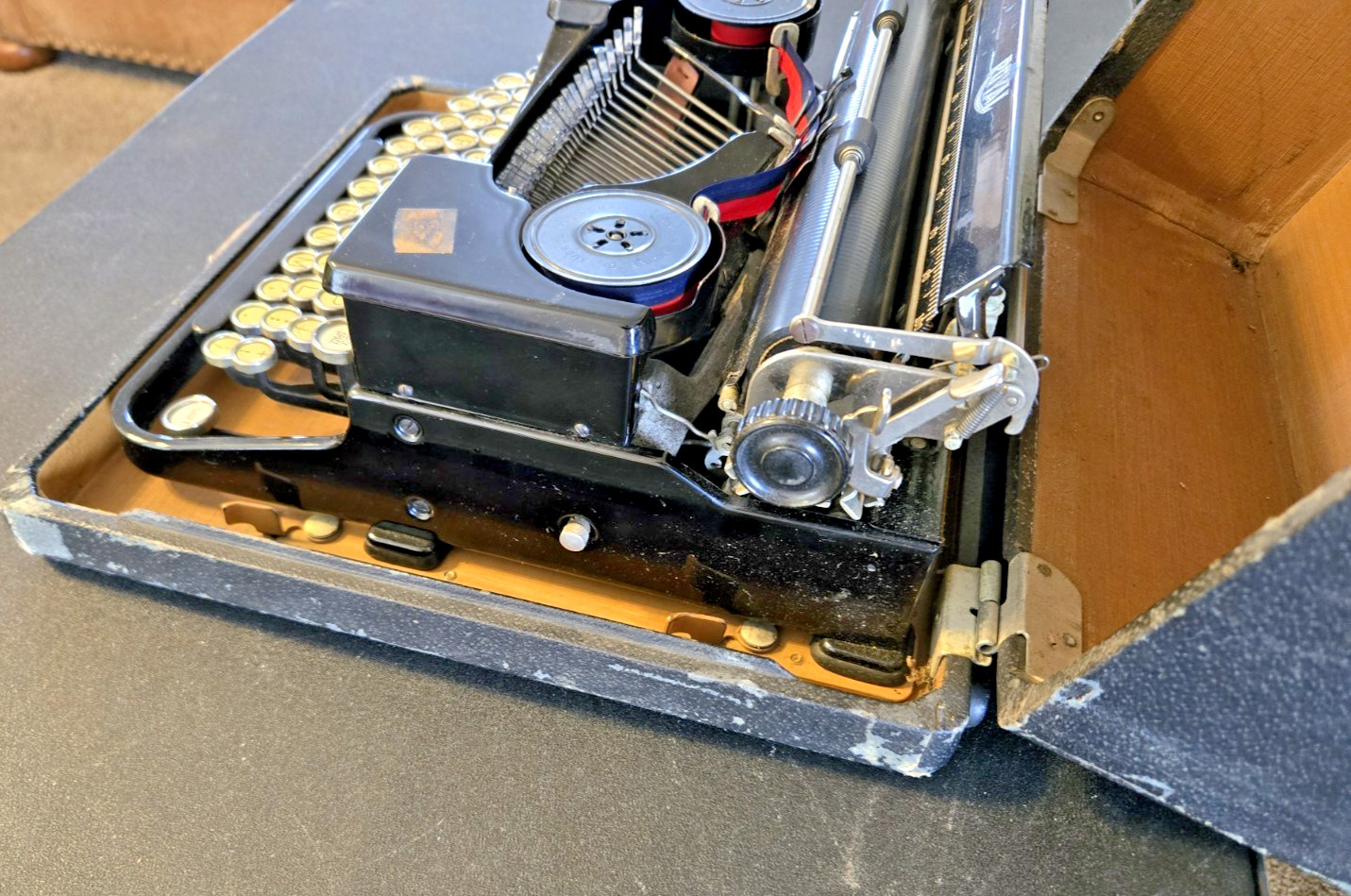 The Antique 1934 Royal Model O Vintage Typewriter is a nostalgic collectible piece for enthusiasts of vintage technology and typewriters. This manual typewriter by Royal features a portable design and comes with its original case, adding to its charm and authenticity. With its classic design and historical significance from the year 1934, this typewriter is a unique addition to any collection of writing instruments or vintage items. Works great as you can see i typed using every key. The case has wear but the Typewriter is in fantastic condition
