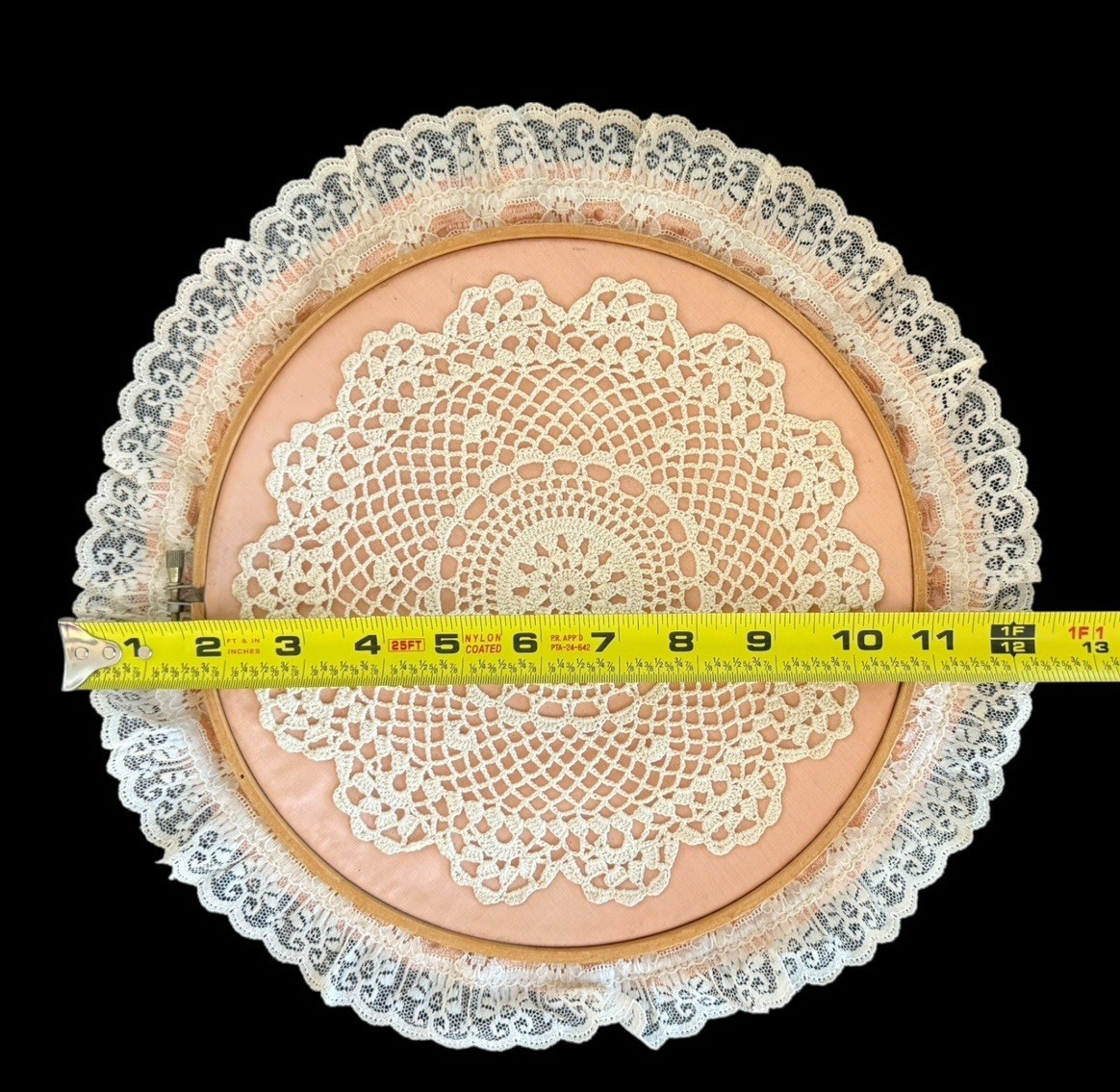 Lace Art Wall Hanging Wooden Hoop 9 inches Homemade Crafts Needlepoint Specs
