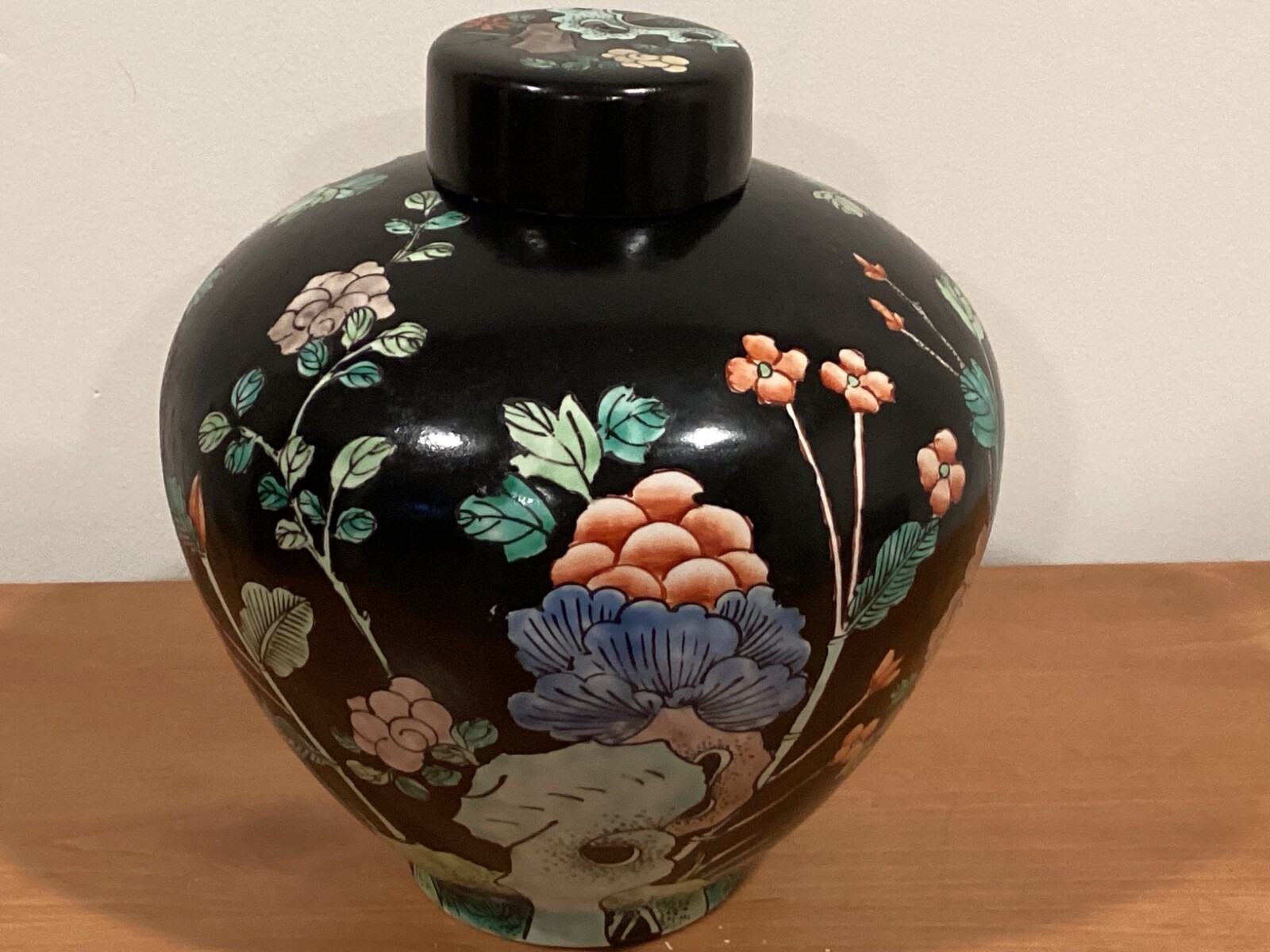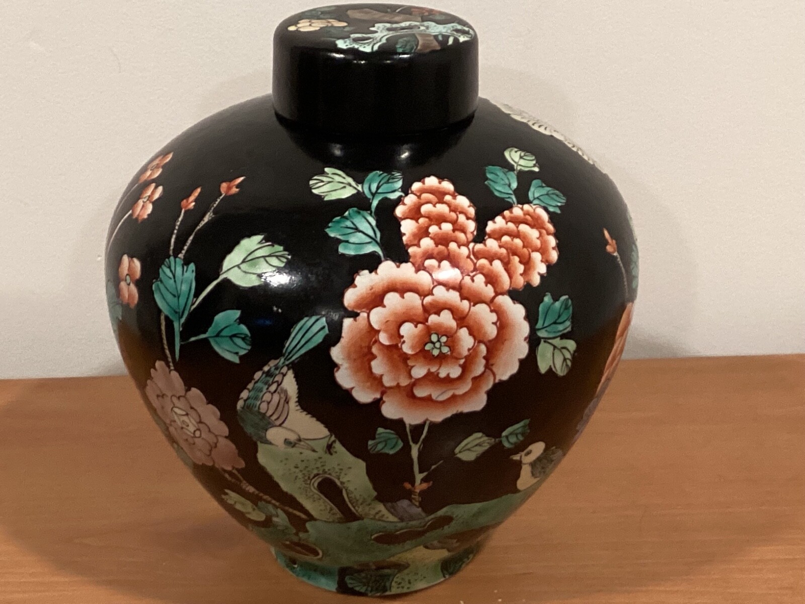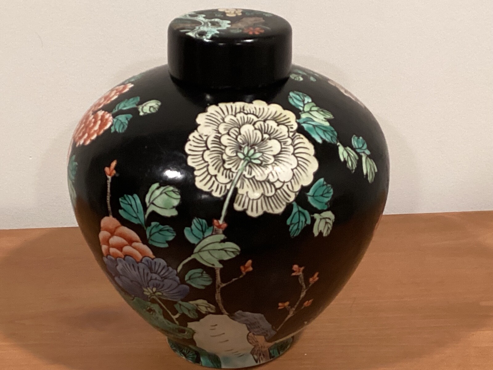 Vintage Chinese Black Floral Lidded Ginger Jar 9 x 8, Collectible Decor