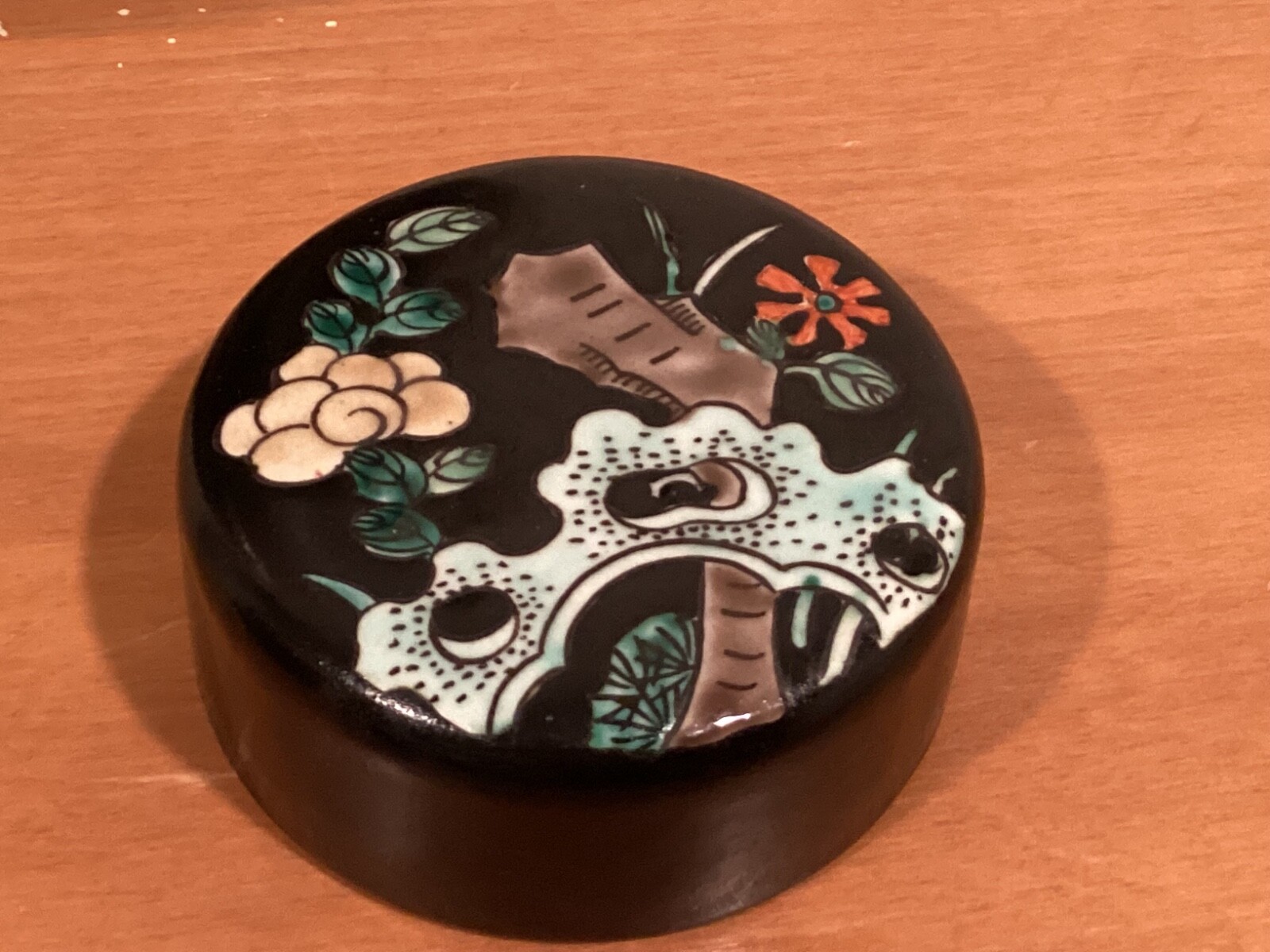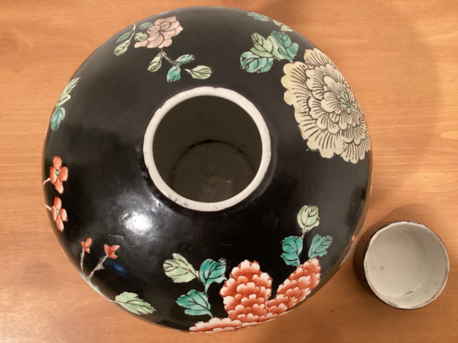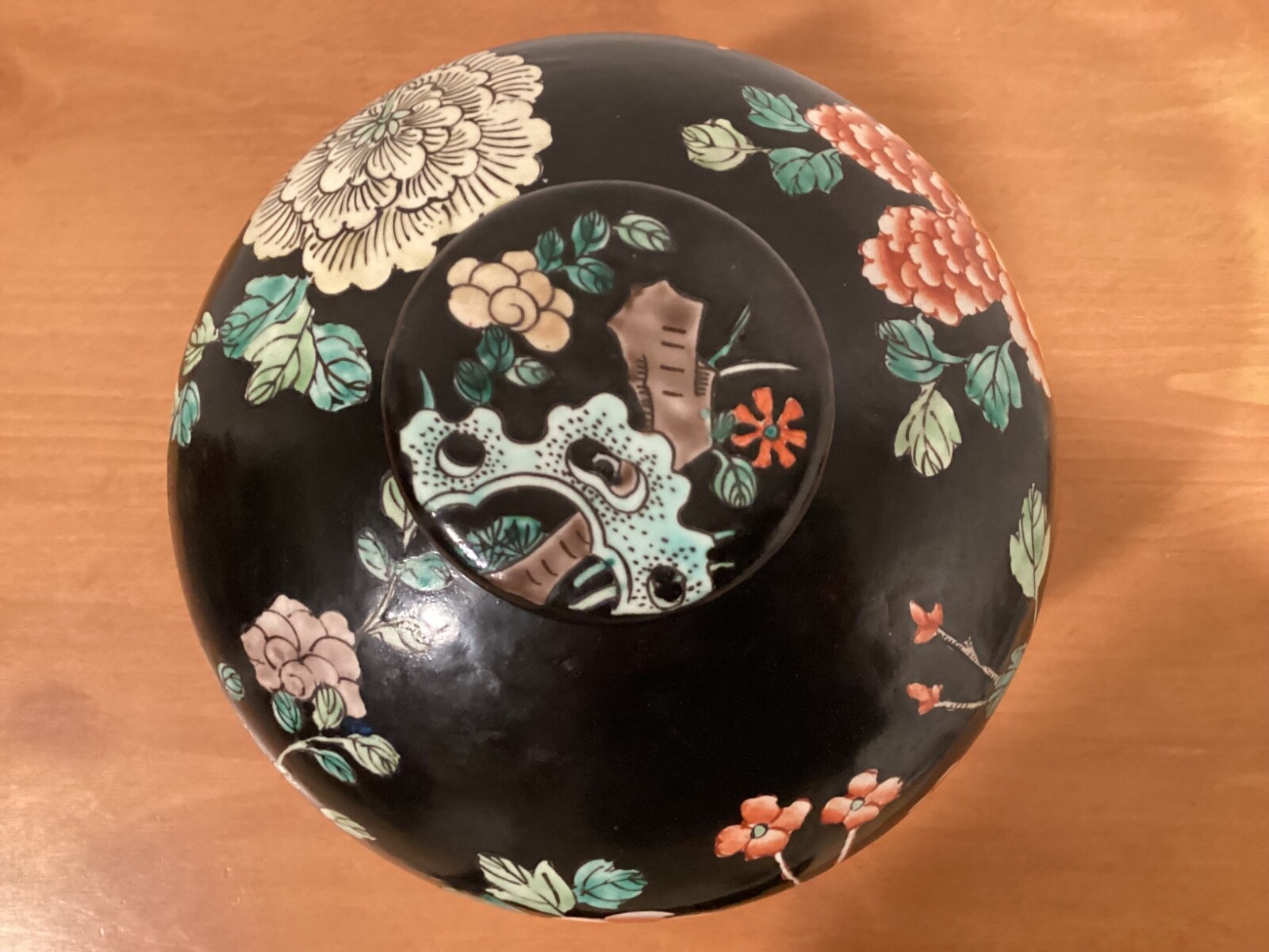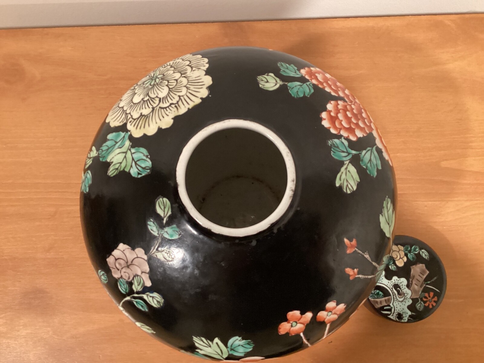Vintage Chinese Black Floral Lidded Ginger Jar 9 x 8, Collectible Decor