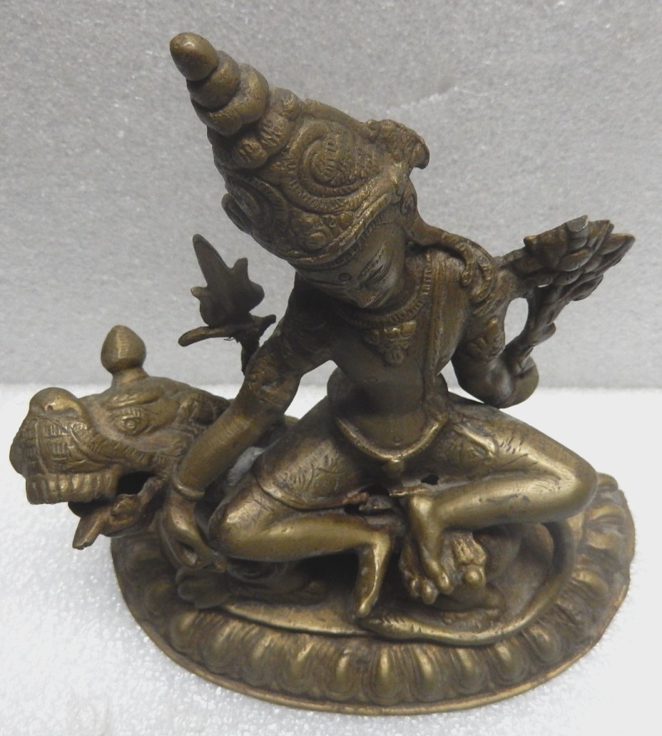 Estate find in beautiful clean, vintage, as found condition. 8-1/2" tall, by 7-1/4" by 3-1/4", heavy, solid brass. Highly detailed statue of Buddhist diety SIMHANADA MANJUSHRI riding a lion or dragon with an ornate backsplash. Appears to have no damage as far as I can see, but I cannot be absolutely certain. Please take all of the above into consideration when bidding ~ Thanks!