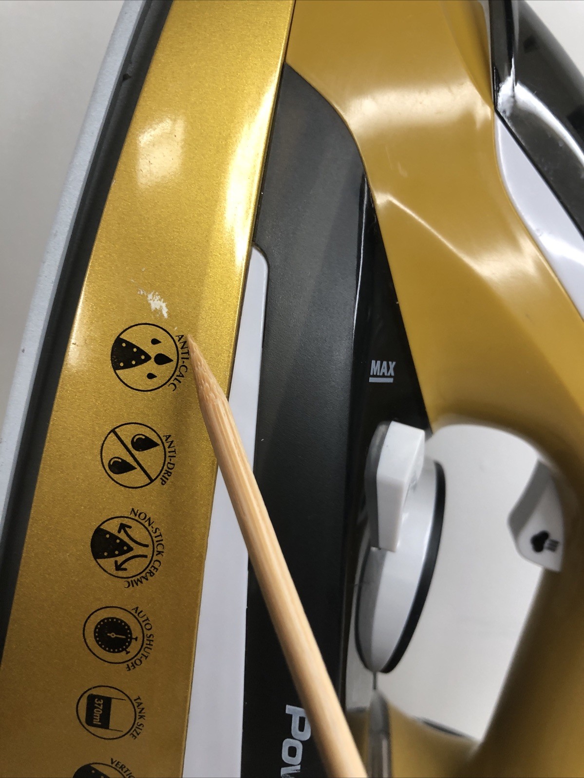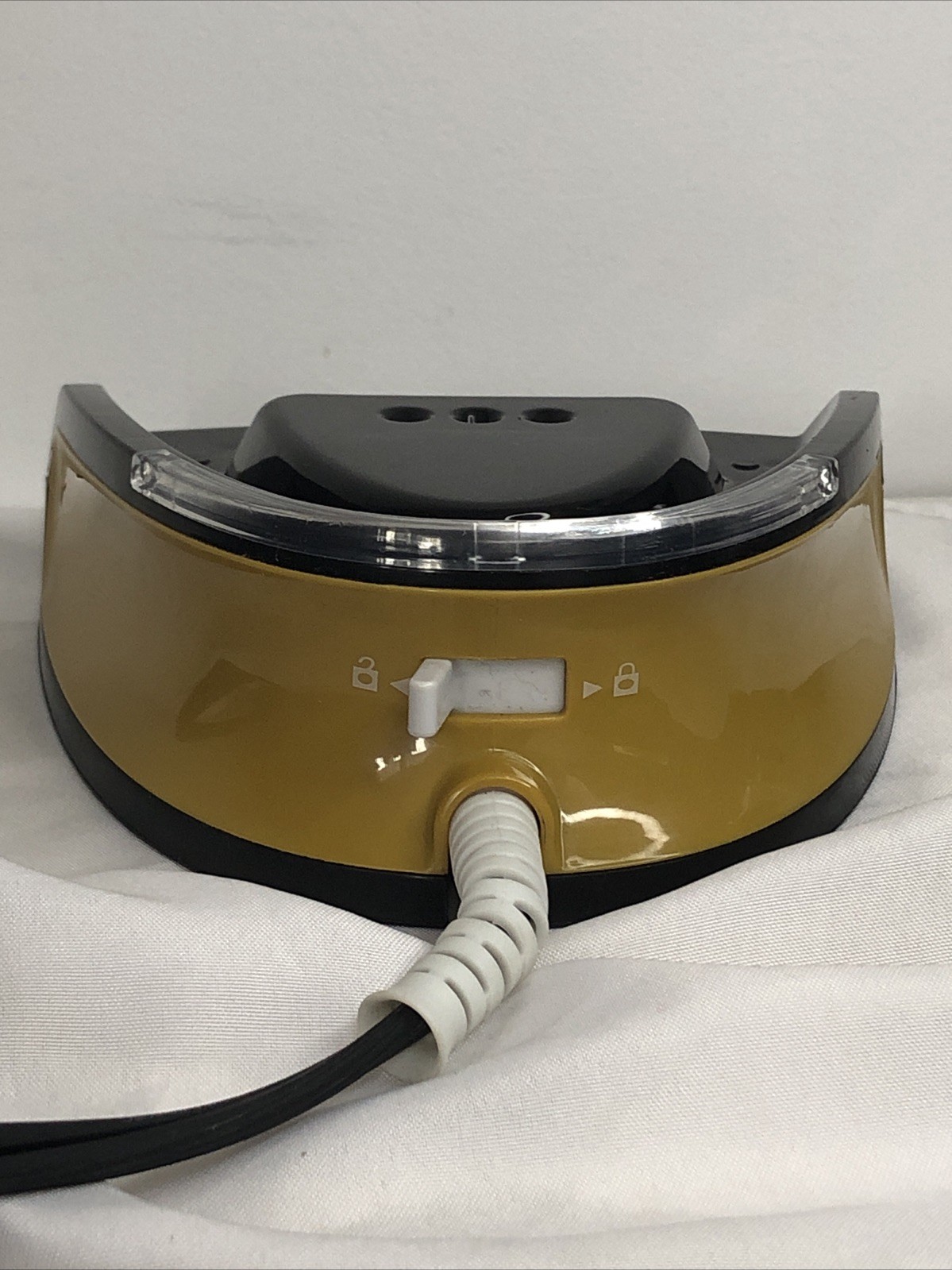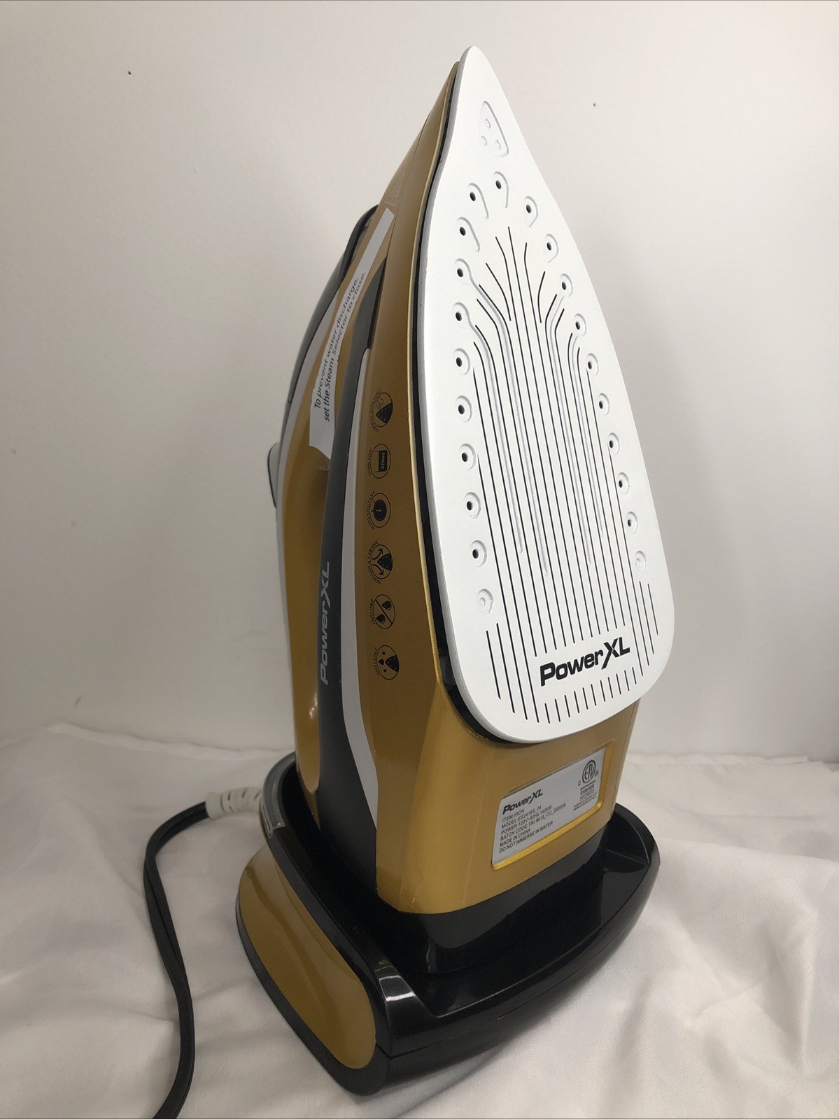 🔹 PowerXL Cordless Steam Iron ES24165-04 – Gold & Black 🔋 Cordless design – tangle-free and easy to maneuver ⚡ Quick-heat base keeps iron hot between uses 🧺 Nonstick ceramic soleplate glides smoothly on all fabrics 🌫️ Adjustable steam & temperature for every fabric type 🧼 Self-clean & vertical steam functions for easy maintenance ✨ Sleek gold & black finish 📦 Includes charging base, no water pitcher (I used a standard measuring cup) 14 page instruction manual will be emailed to you to reduce postage charge.I am the original owner. Lightly used & works as it should.