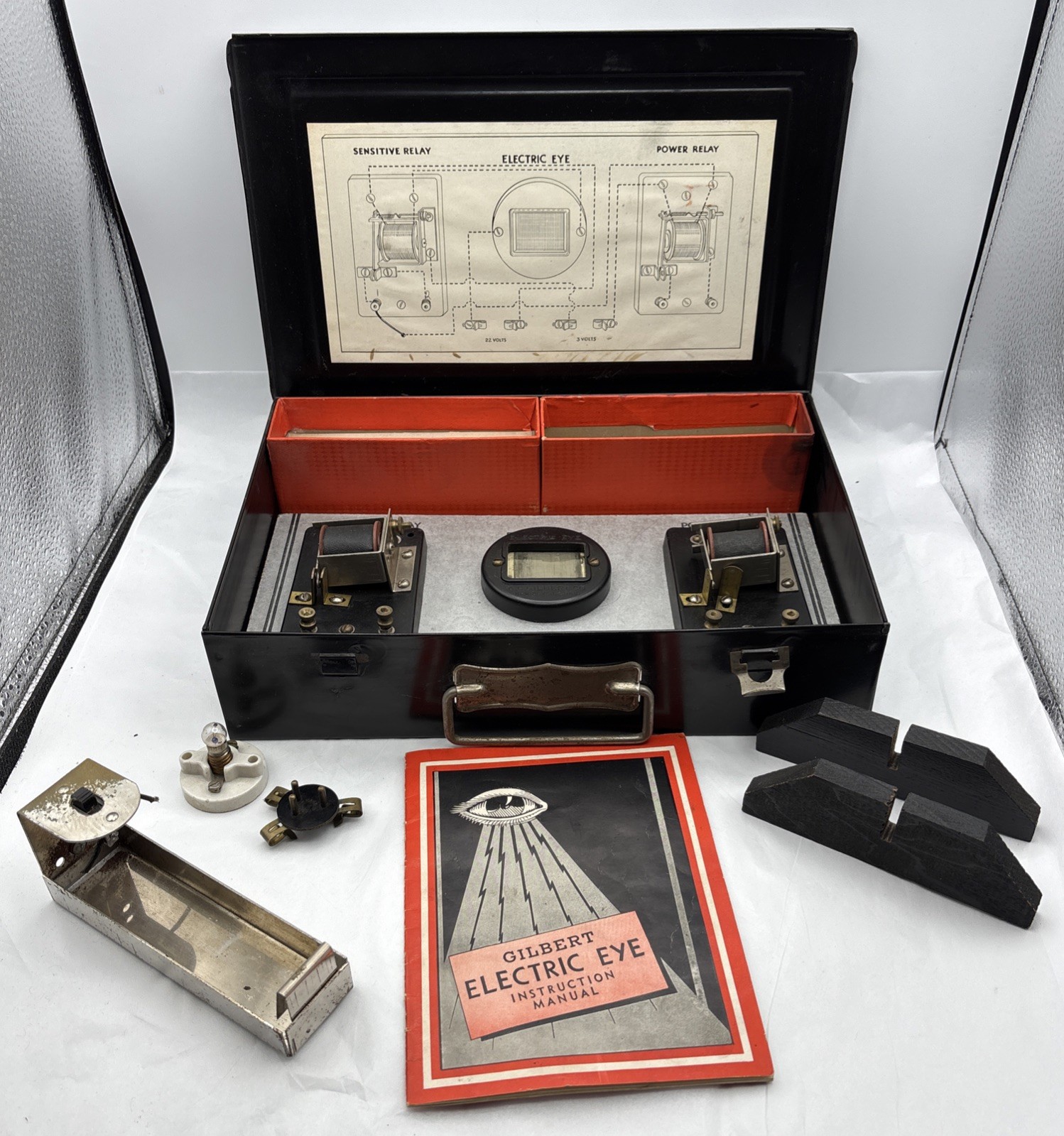 Gilbert Electric Eye Set, Black Case, 1930's Vintage, OriginalGilbert Electric Eye Set, Black Case, 1930's Vintage, OriginalVery Good Condition. Not sure if this set is Complete. Original InstructionsView Pictures carefully.Cool old set, not tested. Missing one latch on box. See pictures for condition.Some rusting on box handle and on switch box.