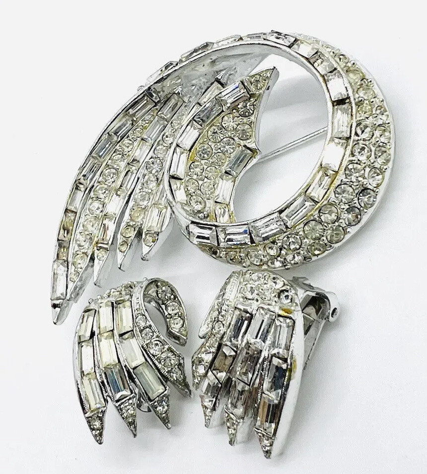 Absolutely beautiful vintage signed PELL sparkling clear baguette rhinestone brooch and earrings demi. Rhodium plated metal set with clear baguette and round rhinestones in a swirl design. In excellent vintage condition with minimal age appropriate wear. NOTE…. The light box makes these appear slightly yellow but in actually and in person…the stones are not yellow at all. Brooch measures 2 5/8 inches long by 1 5/8 inches wide. Roll over clasp secure the matching clip back earrings are 1 inch tall by 3/4 inch wide. Clip backs secure.