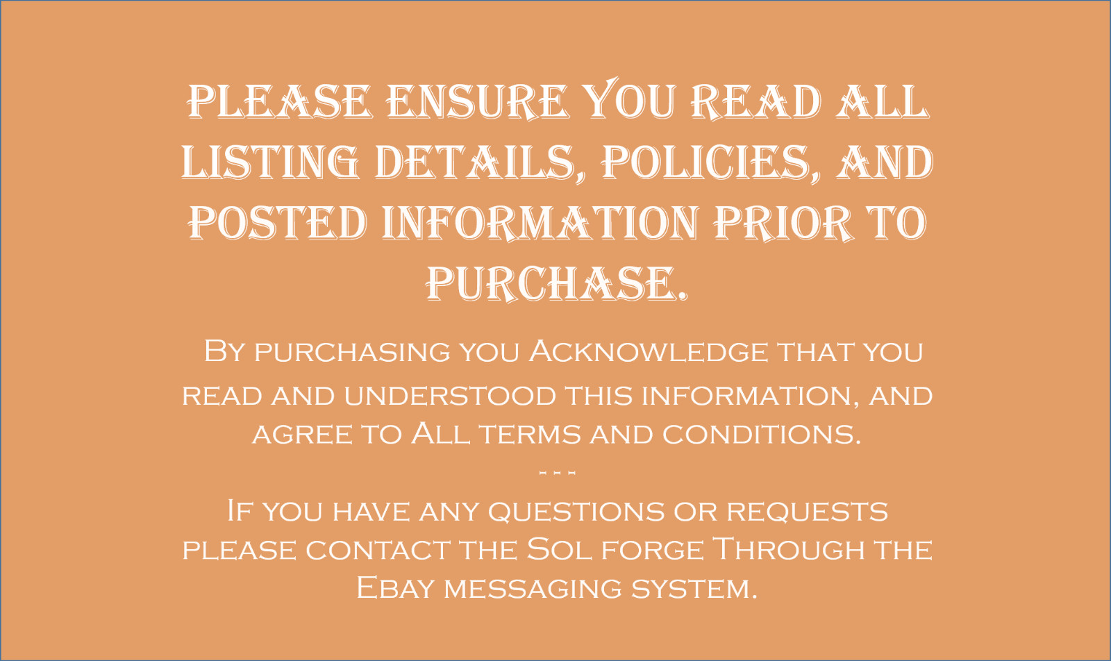 size or finish shown that you have ordered. Differences from piece to piece are to be expected as they are created by a blacksmith that handcrafts all pieces. These differences may include but are not limited to visual differences of the stock material or finish, natural (+/-) tolerances due to the process of working the steel, perceived proportions on the sample image (notably when selecting the larger or smaller sizes on a listing). When not utilizing an upgraded option, a generically usable fastener(s) is provided as a courtesy and may vary due to many variables including supplier availability. Anything not stated or described will be left to the artist’s/blacksmith’s/creator’s (or more simply… Sol Forge’s) discretion and interpretation, unless discussed prior to purchase. For anything not discussed, you acknowledge release of Sol Forge (the little ole forge on the farm) from any liability or expectation.If you have any questions, please do not hesitate to contact Sol Forge via Ebay’s conversations or messaging system (to better help adhere to their buyer and seller policies) and Sol Forge will gladly assist.If you have any questions about your specific project or installation, please consult a qualified local contractor or engineer.By purchasing you understand that Sol Forge is not responsible for any damage due to improper use or installation.