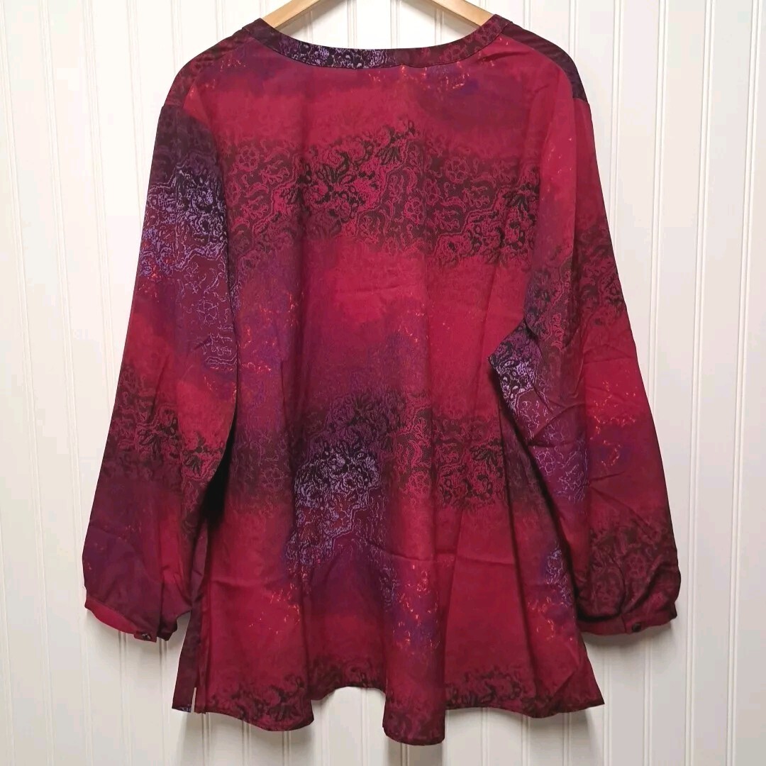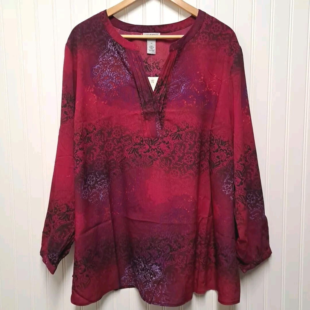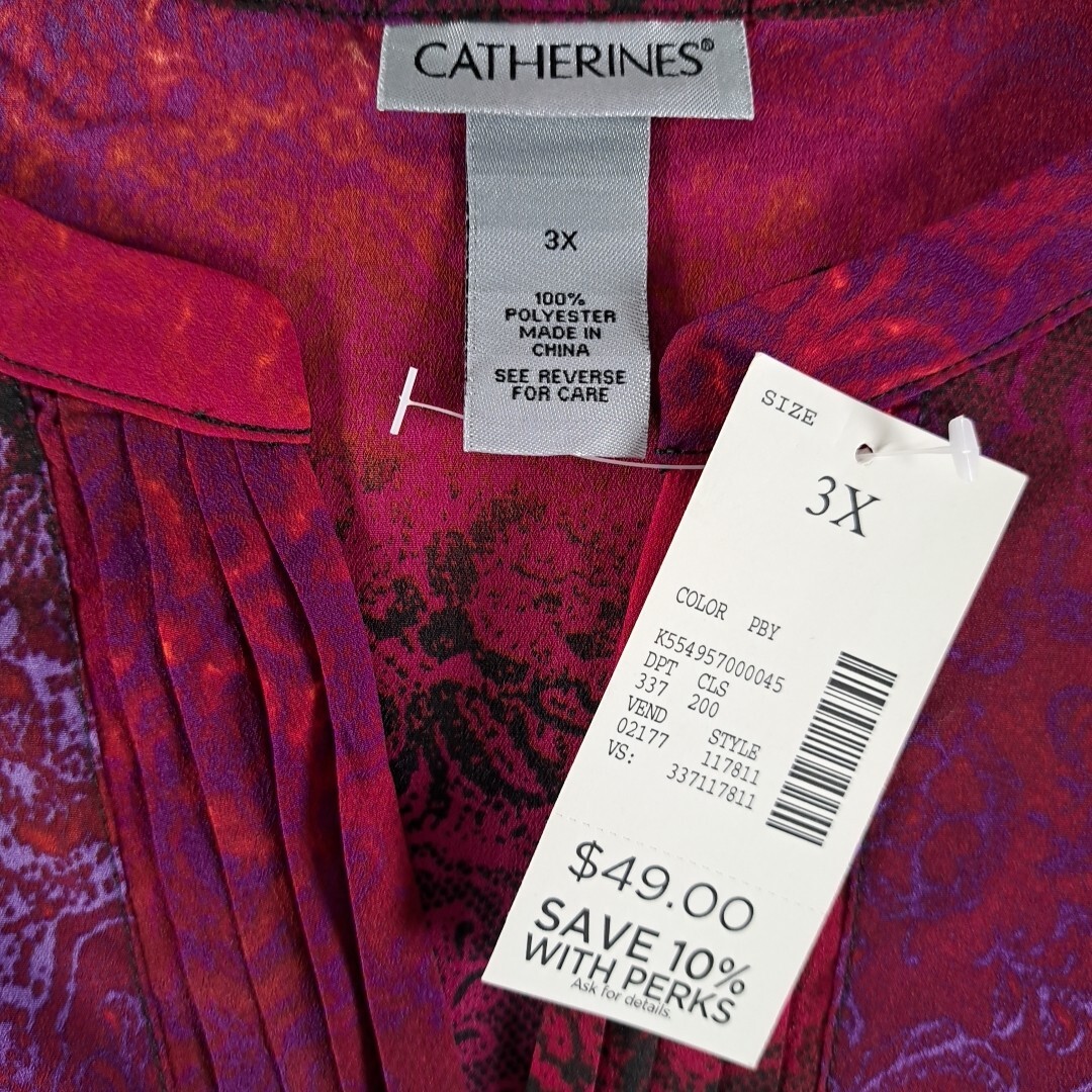 NWT Catherines Tunic Blouse Womens 3X Dark Fushia Printed V-Neck Popover Top Specs