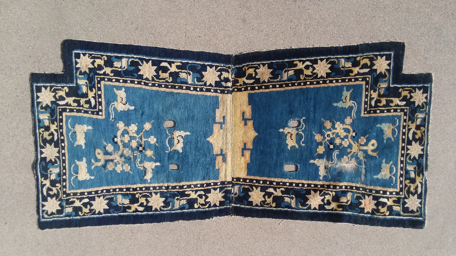 DESCRIPTION: Antique Chinese blue saddle wool rug. Each side depicts a plum tree with flower blossoms & surrounded by 5 butterflies. Border depicts a continuous lotus scroll. All photos are taken under the sun, & shown one side is a little darker, both the blue & creamy beige. Do not know if resulted from diff dye batch or fading from sun. However, it is not that noticeable indoor under natural light. Relatively thin & soft, could be folded up into a brick form. No