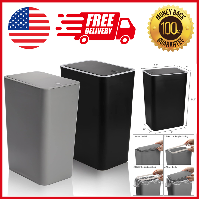 Premium Quality: Trash container is made of durable plastic. We make it out of a high-grade polymer that is both sturdy and light. You can rest assured that it will not fracture under the strain of its enormous load. Capacity: Pack of 2, each trash can 15 Liter/4 Gallon, Size: 9.8"L (Top length) x 7"W (Top width) X 14.1"H, great for bedroom, bathroom, office, conference room, display room, shop, kitchen, car and more. Save Floor Space: This plastic garbage can is quite slim and narrow for its volume. It has a small footprint, so it can be placed or hidden in almost any place. Easy To Use: The pop-up design lid is simple and convenient. Simply tap the button to open or closed the lid. The plastic ring can fix the garbage bag and prevent the garbage bag from slipping away.