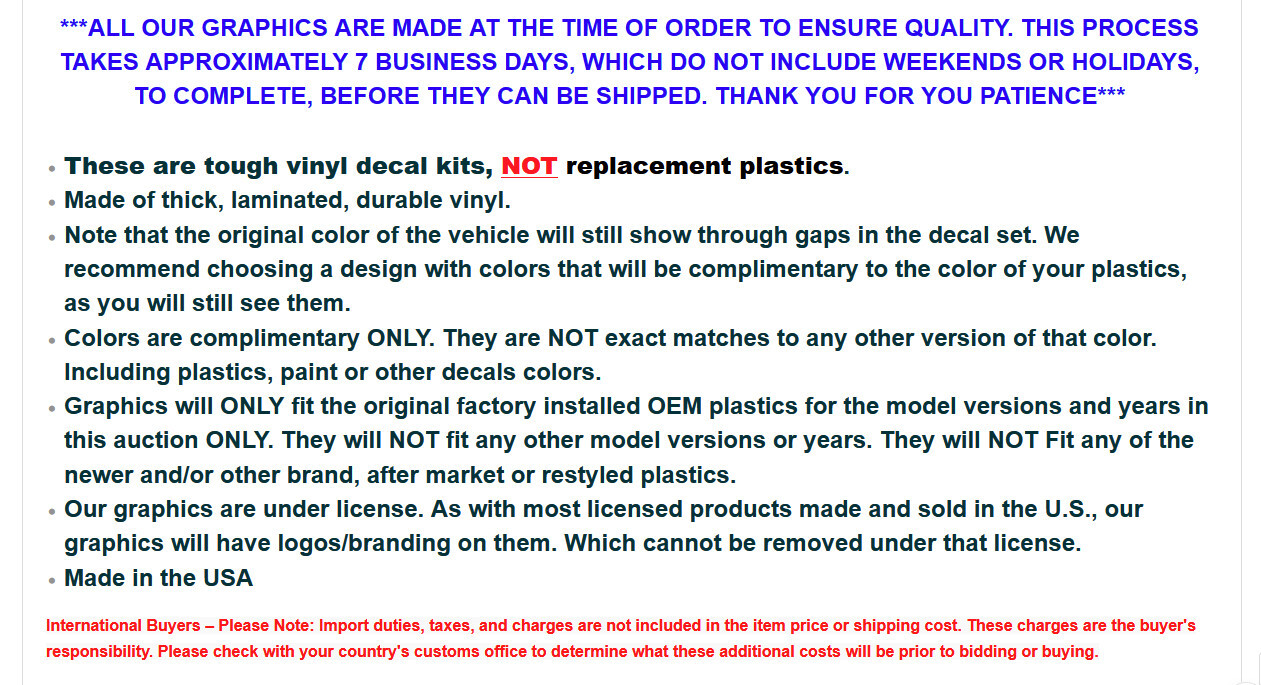 color of your plastics, as you will still see them.Colors are complimentary ONLY. They are NOT exact matches to any other version of that color. Including plastics, paint or other decals colors.Graphics will ONLY fit the original factory installed OEM plastics for the model versions and years in this auction ONLY. They will NOT fit any other model versions or years. They will NOT Fit any of the newer and/or other brand, after market or restyled plastics.Our graphics are under license. As with most licensed products made and sold in the U.S., our graphics will have logos/branding on them. Which cannot be removed under that license.Made in the USA International Buyers – Please Note: Import duties, taxes, and charges are not included in the item price or shipping cost. These charges are the buyer's responsibility. Please check with your country's customs office to determine what these additional costs will be prior to bidding or buying.