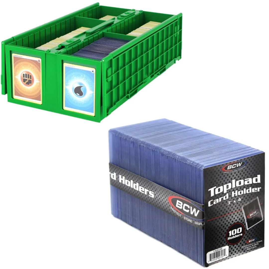 color adds a touch of style to your collection.Capacity and Compatibility Note: The BCW 1600-count plastic card bin features a versatile two-row design that can hold:Approximately 1600 loose standard trading cardsUp to 440 standard 3x4 (20pt) toploaders (approximately 220 per row)Various magnetic card holders or deck boxesWith this bundle, you receive 100 standard 3x4 toploaders, meaning the included single green bin will comfortably hold all 100 toploaders with significant additional space for more top-loaded cards or other protective holders.Key Features & Benefits:BCW Collectible Card Bin 1600-Count (Green):Premium Construction: Made from durable, acid-free polypropylene plastic for long-lasting protection and peace of mind.High Capacity: Designed to hold up to 1600 loose trading cards, or a substantial number of sleeved or top-loaded cards.Toploader & Magnetic Friendly: Rows are wide enough to accommodate standard 3x4 toploaders (like the ones included), as well as magnetic one-touch holders and deck boxes.Secure & Portable: Features dual hinged lids with secure latches to keep contents safe, and a convenient recessed carrying handle for easy transport to events or game nights.Organizational Aids: Includes two adjustable card bin partitions to help you sort and organize your collection efficiently within the two rows.Stackable Design: Feet on the bottom interlock with the lid of another bin, allowing for stable and efficient vertical storage.Sleek Aesthetic: The vibrant green