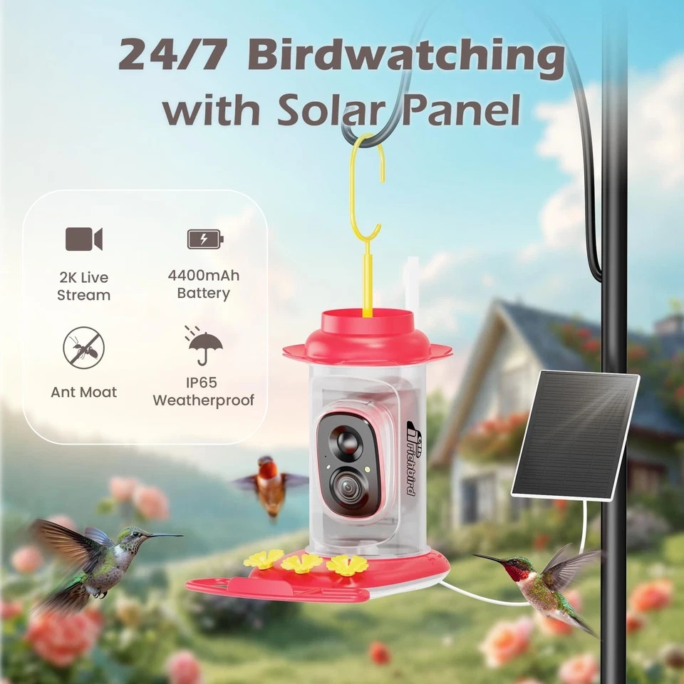 Smart Hummingbird Feeder with Camera Solar Powered, AI Identify, Instant NotificWorld’s First Interactive Birding App: RichBird smart hummingbird feeder seamlessly pairs with CoolFly – the first-ever app designed for interactive birdwatching! Enjoy vibrant community features like video sharing, likes, comments, and group chats with fellow bird lovers. Explore our extensive bird database packed with species traits, authentic bird calls, diet details, and more. RichBird bird feeder is gift for Hummingbird Lovers, allowing families and friends to enjoy birdwatching together.Lifetime Free AI Bird ID: Receive instant alerts when hummingbirds visit your hummingbird feeder camera. Watch, save, and share recorded clips in the CoolFly app. Post your sightings on CoolFly Square to get AI-generated species identification or let the community help identify them. Turn every visit into an interactive learning experience.Live HD Birdwatching: RichBird hummingbird feeders for outdoors seamlessly connects to your Wi-Fi network (supports 2.4GHz only), and features a 3MP HD camera with instant motion detection—capturing ingbirds in under 1 second. The 140° wide-angle lens and clear night vision deliver stunning 24/7 videos, transforming your backyard into a vibrant birdwatching theater.Live HD Birdwatching: RichBird hummingbird feeders for outdoors seamlessly connects to your Wi-Fi network (supports 2.4GHz only), and features a 3MP HD camera with instant motion detection—capturing ingbirds in under 1 second. The 140° wide-angle lens and clear night vision deliver stunning 24/7 videos, transforming your backyard into a vibrant birdwatching theater.24/7 Solar Monitoring & Weatherproof: RichBird smart bird feeder with camera powered by solar energy, it guarantees a continuous 24/7 ingbird watching experience. The bird feeder with IP65 waterproof withstands various weather conditions, providing a reliable year-round food source for hummingbirds.RichBird Smart Hummingbird Feeder with Camera Solar Powered, AI Identify, Instant Notification, Leakproof & Ant Moat, Outdoors Hanging, Idea Gift for Bird Lovers (20 oz)ShippingWe offer FREE shipping on all orders!We ship within Three business days of payment, usually sooner.We use a selection of shipping services such as UPS, FedEx, USPS etc.We only ship to the lower 48 states, no APO/FPO addresses or PO Boxes allowed.Local pickups and combined shipping options are not provided at this time.ReturnYou can return a product for up to 30 days from the date you purchased it.Any product you return must be in the same condition you received it and in the original packaging. Please keep the receipt.PaymentWe accept payment by any of the following methods:PayPalPlease pay as soon as possible after winning an auction, as that will allow us to post your item to you sooner!FeedbackCustomer satisfaction is very important to us.If you have any problem with your order, please contact us and we will do our best to make you satisfied.Contact UsIf you have any queries, please contact us via ebay. We usually respond within 24 hours on weekdays.Please visit our eBay store to check out other items for sale!Thank you for shopping at our store.