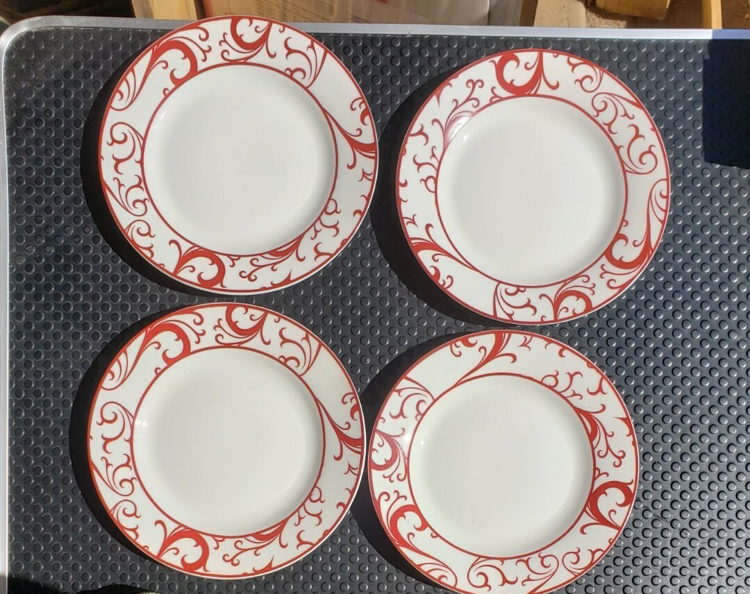 This set includes four Cambridge English by Design salad plates in white with a red scroll pattern, measuring about 7 1/2 inches each. Condition is used; check the listing for details on any wear, marks, or variation in color. A practical choice for everyday salads, desserts, or small sides, and a good match for coordinating Cambridge dinnerware. Free shipping is included, and the item will be packed for safe delivery. Check the listing for details.
