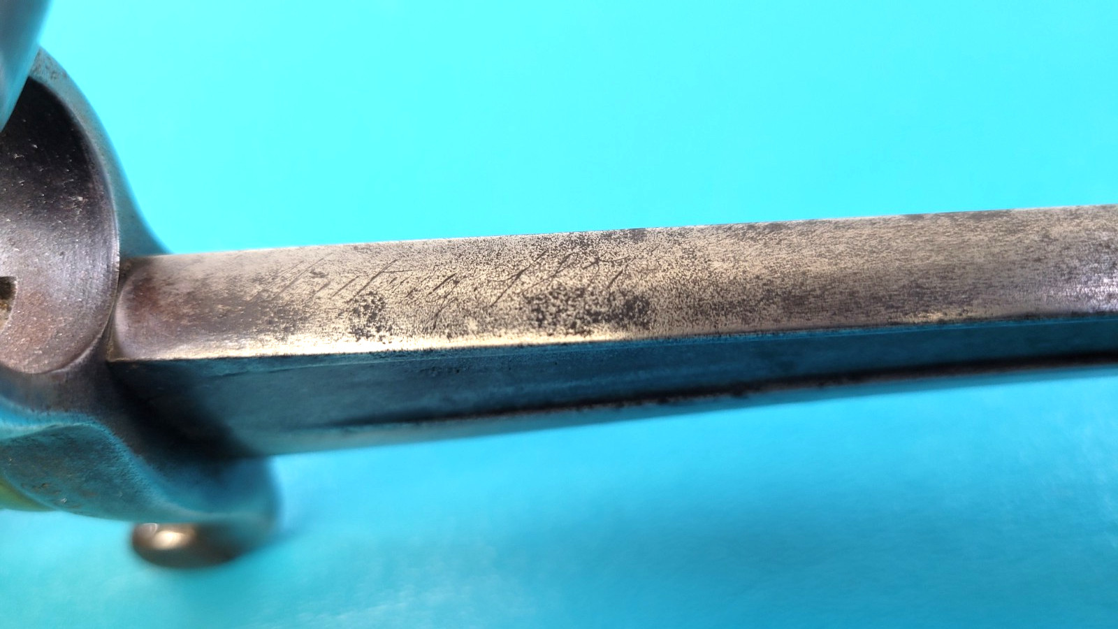 French Model 1842 Sword Bayonet + Sheath. 27.5" OAL, 22.6" blade. Very good condition showing age patina, wear, use, some scattered pin-prick pitting. S/N 999 with scabbard showing a 907. Top of blade signed, ricasso shows cartouches, numbered on top area of spine handle, other side of guard is stamped with a cartouche and W43. Excellent working press-stud, comes with a dent free scabbard which is difficult to find. See photos!
