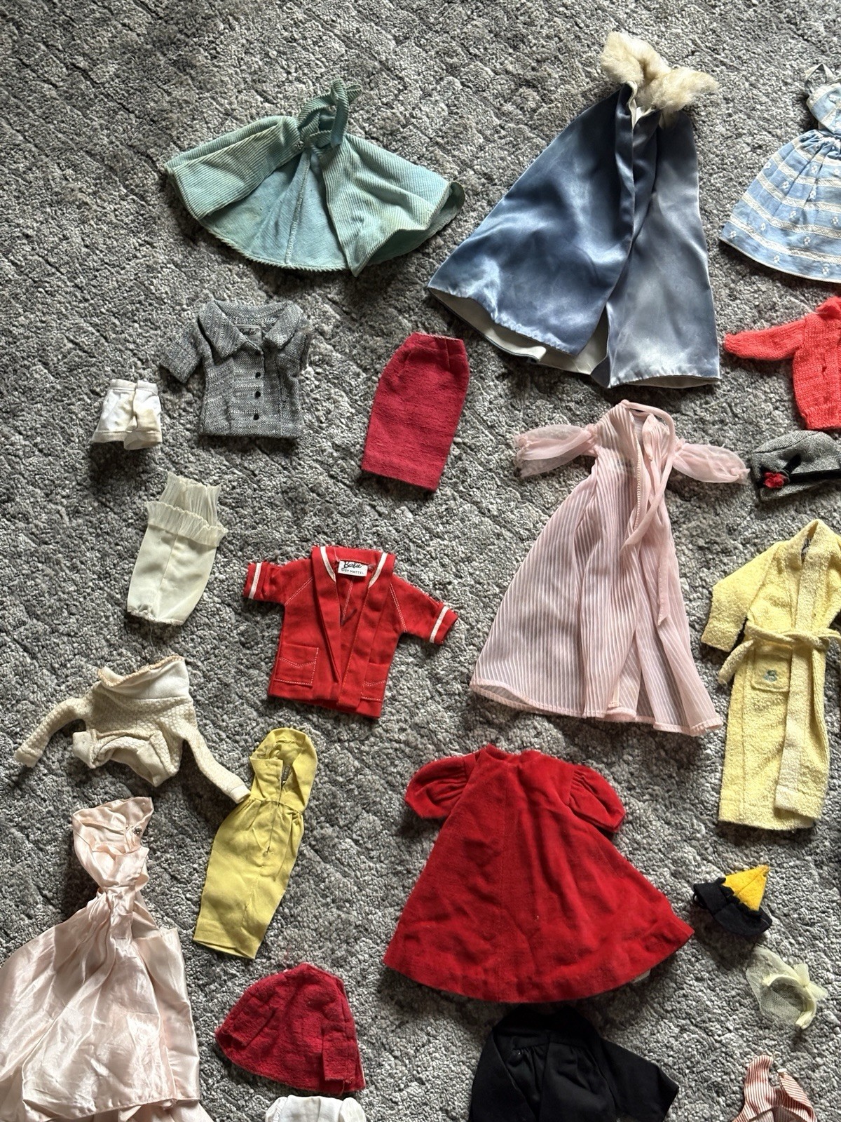 Here is a large lot of vintage Barbie doll clothing from the 1960’s. Some pieces are in good condition but some have damage or need washing. A couple are bad. Sweaters have holes.
