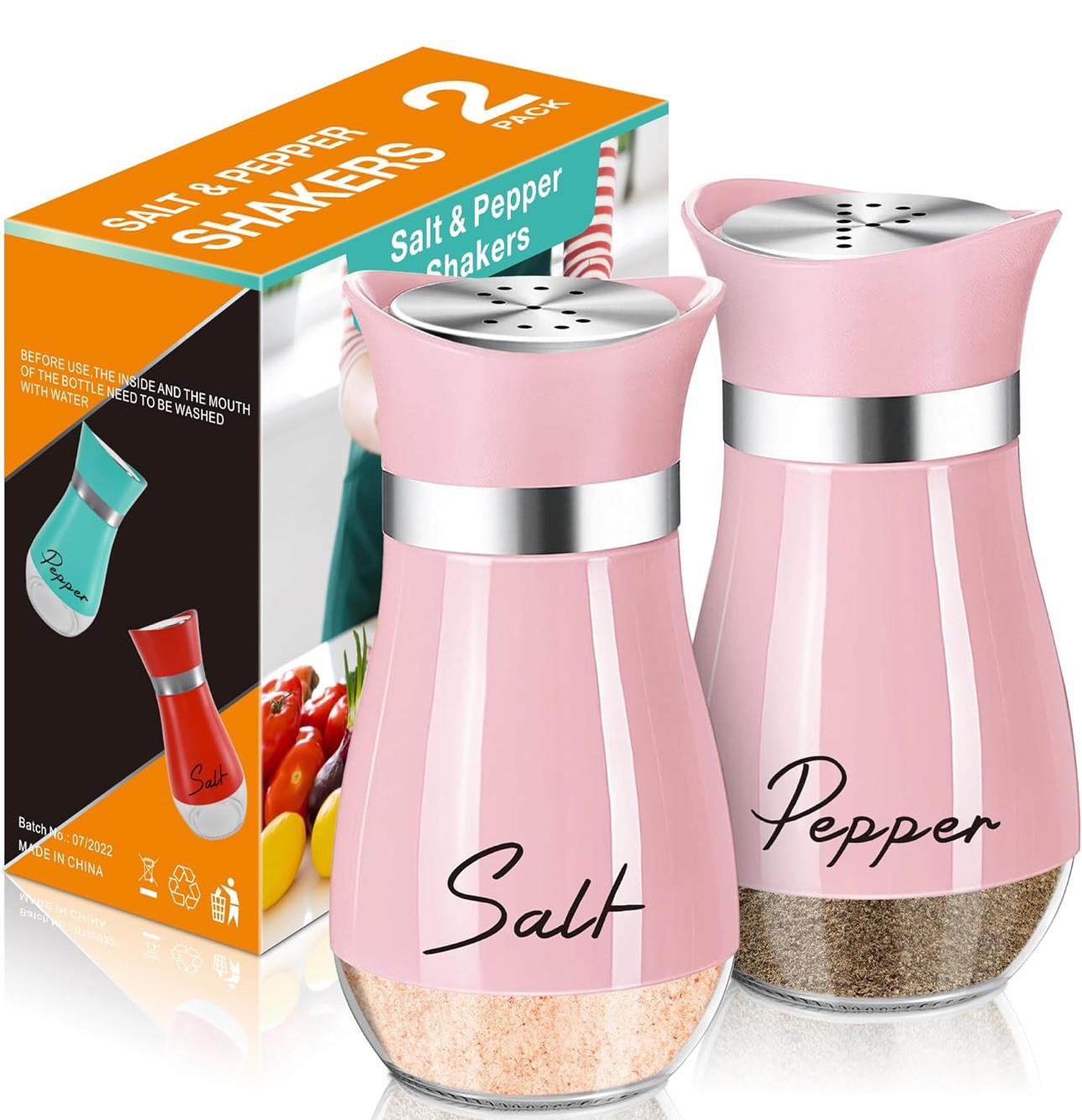 Salt and Pepper Shakers Set,4 Oz Glass Bottom Salt Pepper Shaker Stainless. Pink Specs