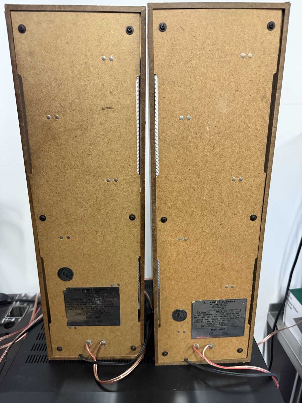 This is a super rare pair of J.C. Penney psychedelic light boxes.You run the A channel speaker lines to your speakers, and the B channel speakers lines to these light boxes. You then adjust the sensitivity knobs until the lights flash to the music. All the bulbs in each unit are brand new, however, because they are delicate, I cannot guarantee that the bulbs will work after going through the shipping process.If a bulb burns out, you just replace it with another. These use incandescent/style Christmas lightbulbs, which are readily available online. I don’t think LED bulbs will work, but I don’t know for sure.They have normal wear and tear from being approximately 50 years old. This includes some of the laminate peeling away, as seen in the photos. The measurements are approximately 21 inches tall, by 6.5 inches wide (not including the knob), by 6.5 inches deep. Please take a moment to look at all the photos. Please ask any questions you have about them before purchasing them.They will be packed with care, and insured, just in case. Thanks!