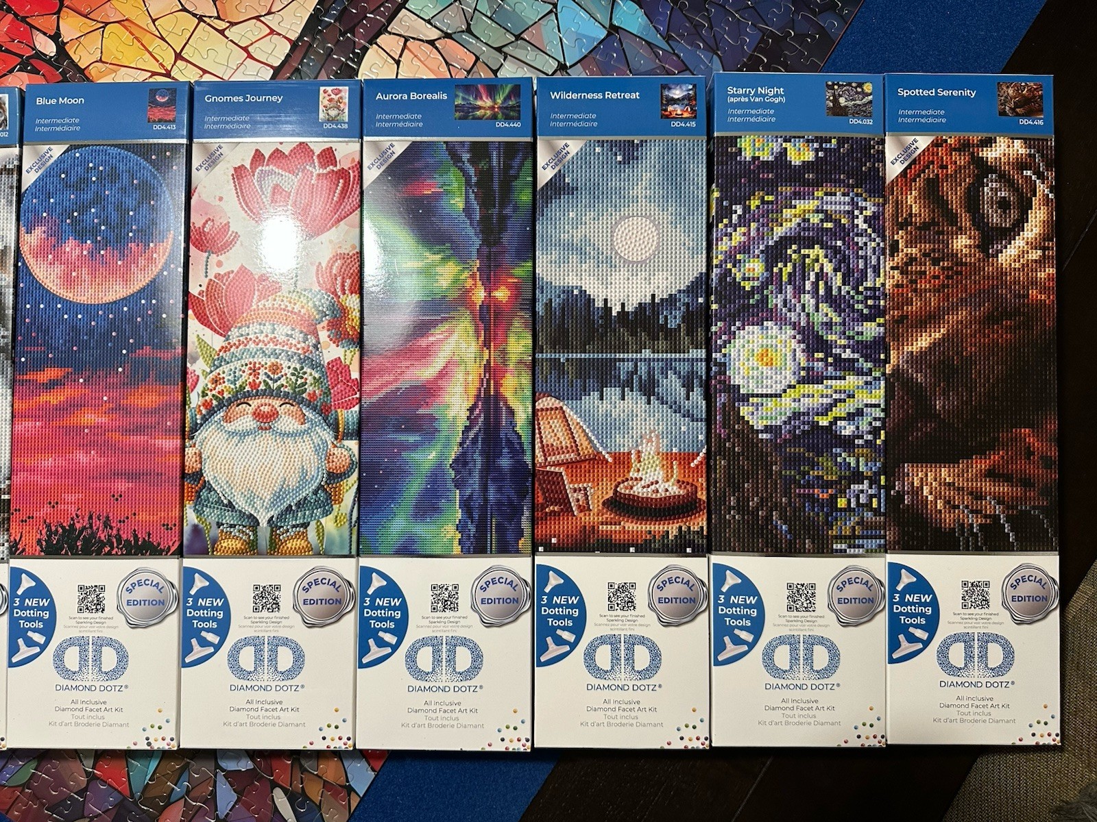 6x NEW DIAMOND DOTZ Painting Special Edition Kits 3 New Dotting Tools 10 Styles — See Pictures!Yes, you get to PICK 6 of the DIAMOND DOTZ Kits BELOW from ALL 10 Styles and ALL Intermediate Skill Level — IF you buy 2 6-packs, then I will include a Retail Display box for FREE:2 Kits — DD4.416 Spotted Serenity1 Kits — DD4.032 Starry Night1 Kits — DD4.415 Wilderness Retreat1 Kits — DD4.440 Aurora Borealis2 Kits — DD4.438 Gnomes Journey2 Kits — DD4.413 Blue Moon1 Kits — DD4.012 Wolf Portrait1 Kits — DD4.396 Rose Portrait1 Kits — DD4.419 Boots n' All1 Kits — DD4.094 DreamcatcherComplete Kit: Includes DIAMOND DOTZ canvas, pre-sorted by color, a stylus, and clear instructions for immediate start — plus 3 NEW Dotting Tools.High-Quality Canvas: Features a durable, high-quality printed canvas with a special layer for secure DOTZ placement.Relaxation and Stress Relief: Diamond painting promotes relaxation and reduces stress through its calming and therapeutic activity.Focus and Concentration: Enhances focus and concentration by requiring precise placement of diamonds on the canvas.Creative Expression: Allows for creativity with the choice of colors, designs, and patterns, and the ability to modify or create unique designs.Unisex and Age Inclusive: Suitable for adults, teens, and kids ages 13 and up, making it a versatile and inclusive craft project.Indulge in the vibrant beauty of nature with the DIAMOND DOTZ® Rose Portrait Special Edition Diamond Painting Kit. This captivating masterpiece showcases a colorful rose with shades of blue, green, purple, red, and orange, creating a stunning portrait that radiates with floral elegance.This DIAMOND DOTZ® Rose Portrait Special Edition Diamond Painting Kit includes a high-quality, full-