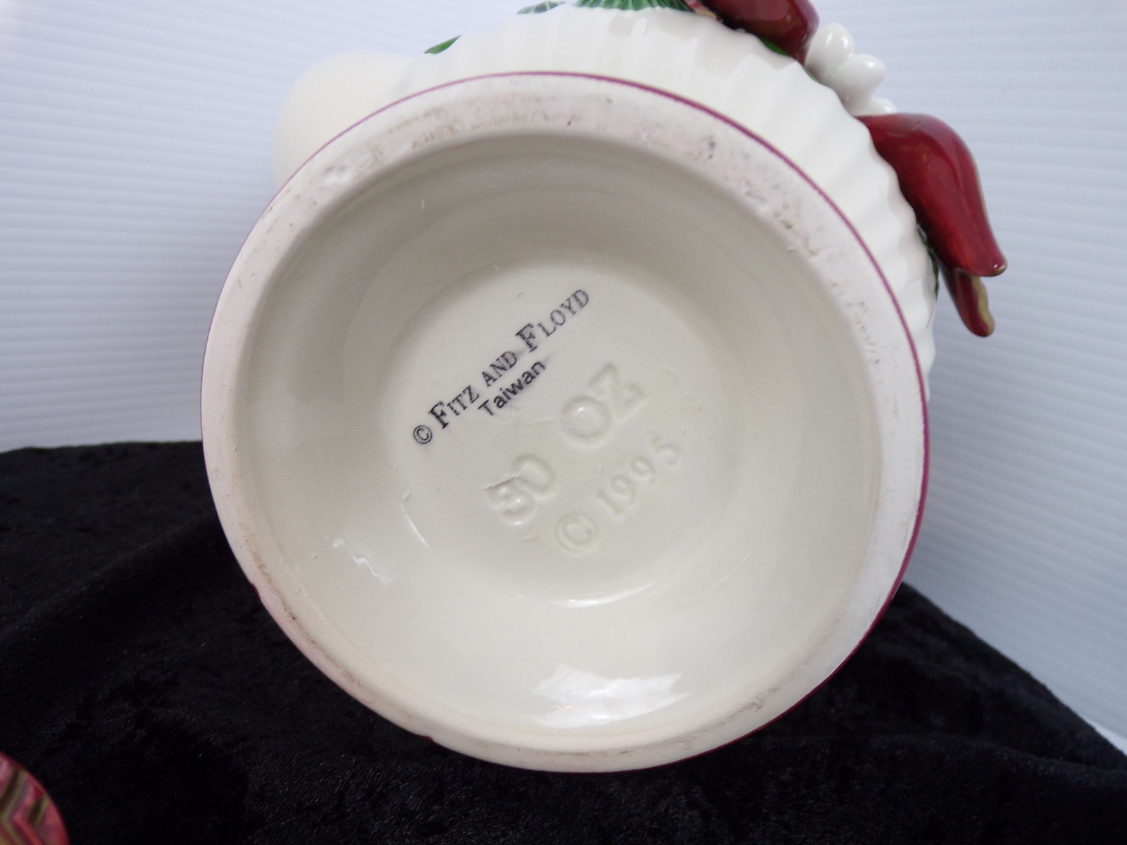 This preowned Fitz and Floyd Christmas teapot in the Rose & Bow pattern (1995) is a decorative collectible piece that remains very displayable. It measures approximately 7" x 9" and is listed as 30 oz. Condition notes: the ribbon has been repaired, and there is a small repaired crack underneath the center flower cluster that is not visible unless viewed from beneath that area. Photos may not fully show the repair due to its location. Free shipping is included. Check the listing for details.