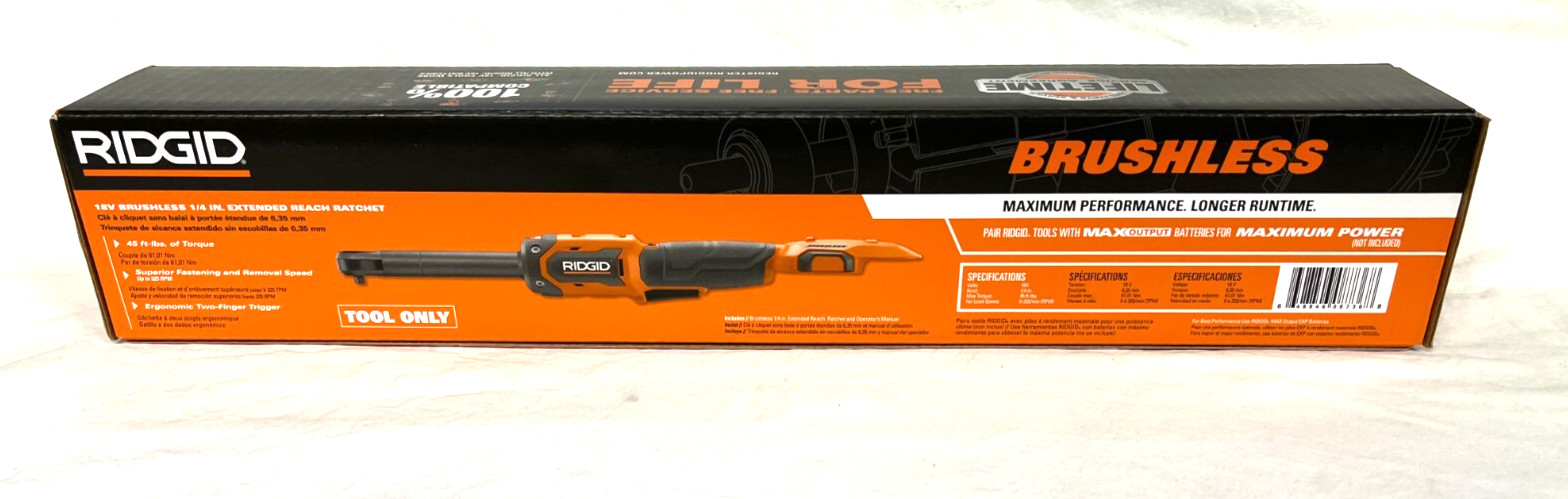 RIDGID 18V Brushless 1/4" Extended Reach Ratchet (Tool Only) Model R866020B(New In Retail Box)Welcome to Romo Co. Tools eBay store! At our store, we believe in a simple philosophy: purchase only what you need or desire. Why invest in a combo tool kit when you may only require a bare tool, a battery, a charger, or a tool bag? We're committed to providing these essential items at reasonable and competitive prices. General Product Information: