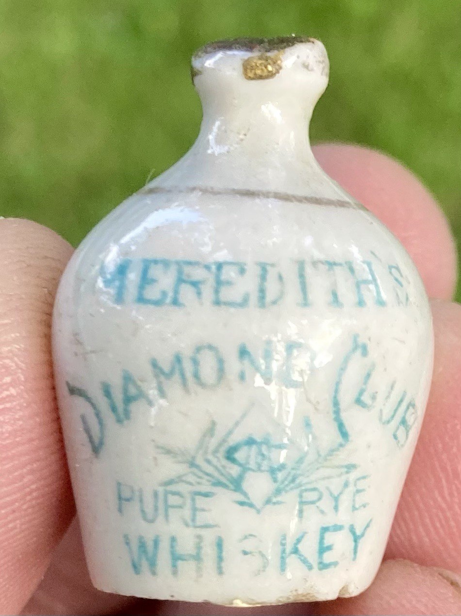 Meredith's Diamond Club Whiskey china jug. Meredith's was from East Liverpool, Ohio. I suspect the mini-jug was meant foe advertising. Could have been used for a charm or pendant. The body is solid and not hollow. The quart jugs were made by KT&K, Knowles, Taylor and Knowles pottery in East Liverpool, Ohio. Not sure if the mini-jug was made by KT&K but the
