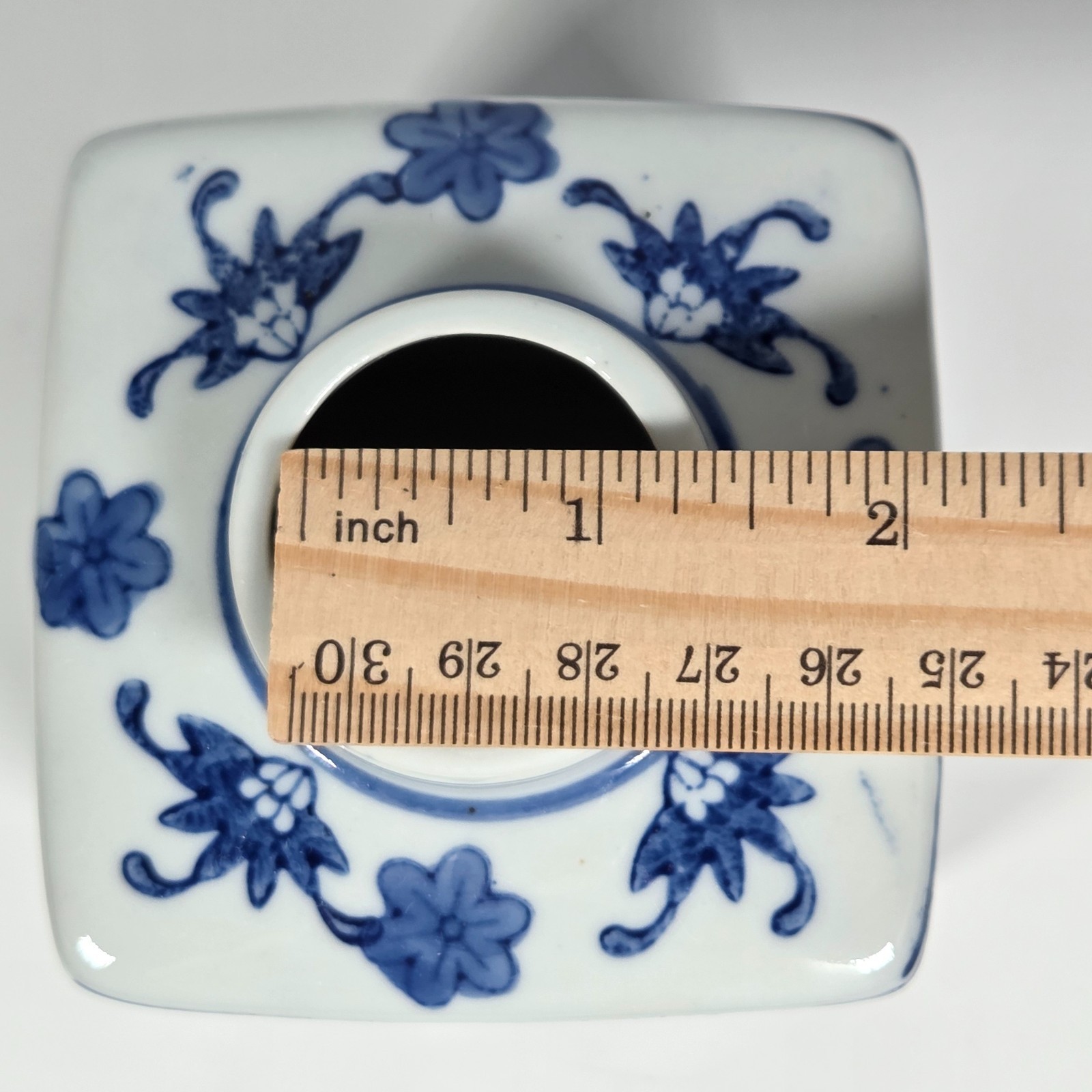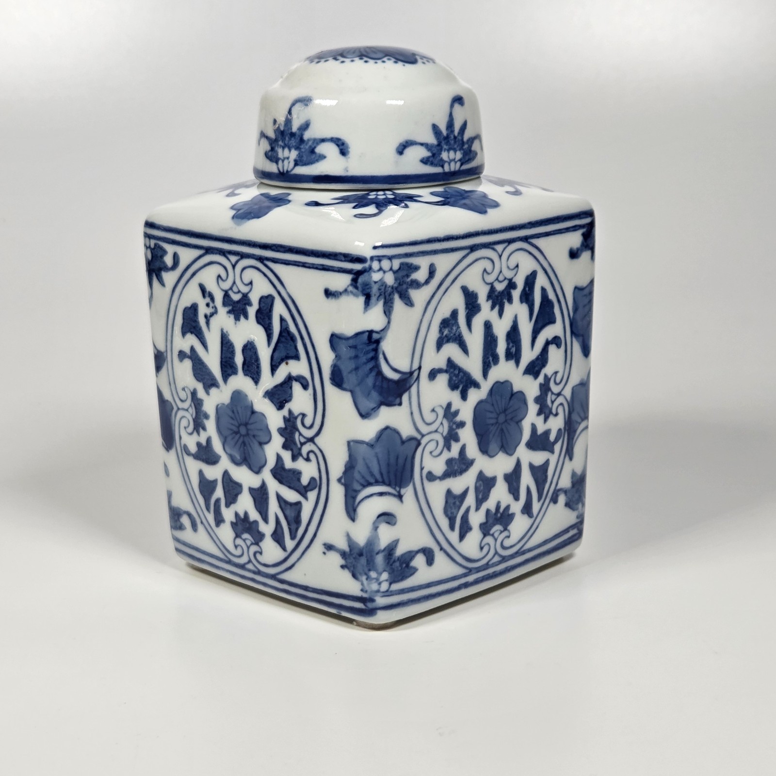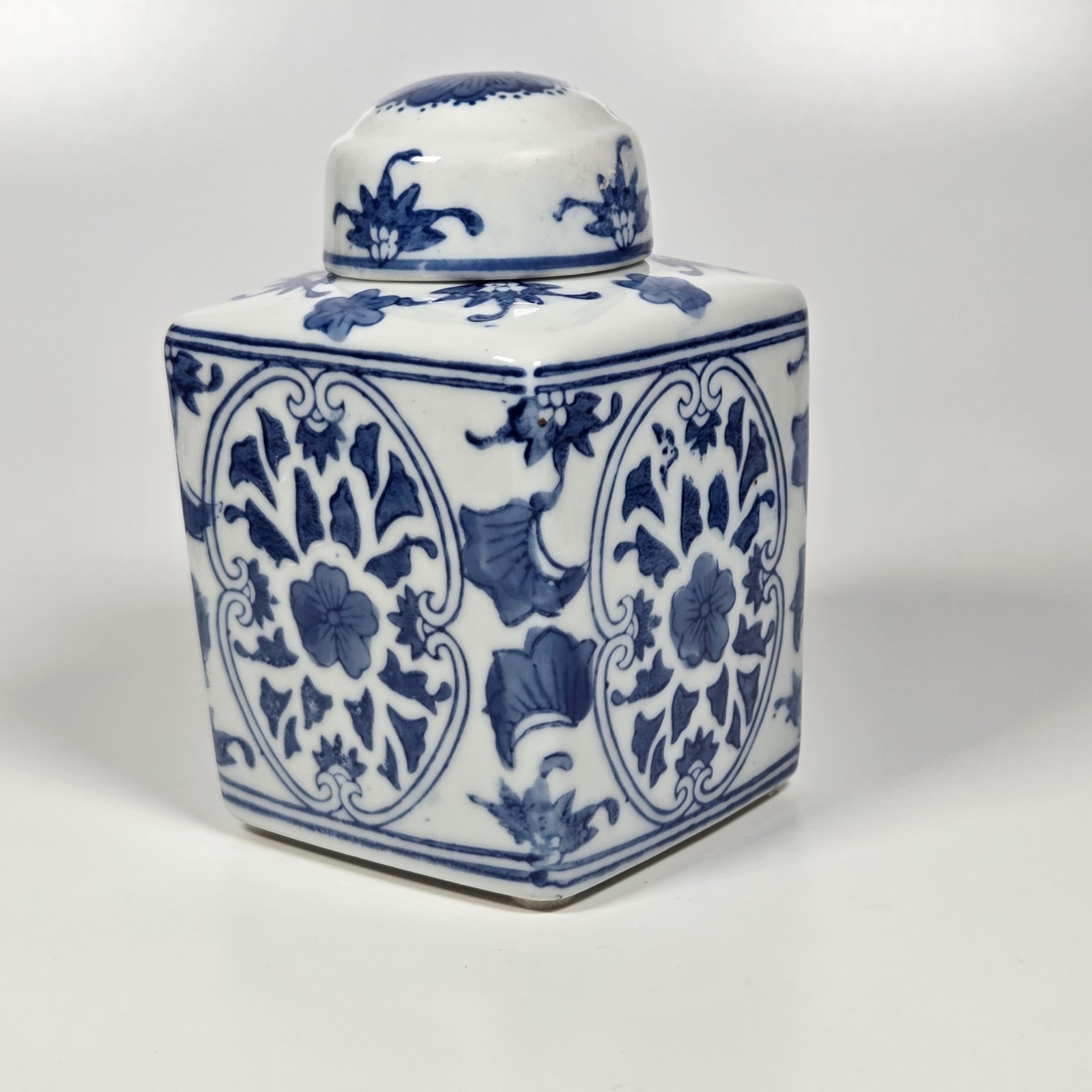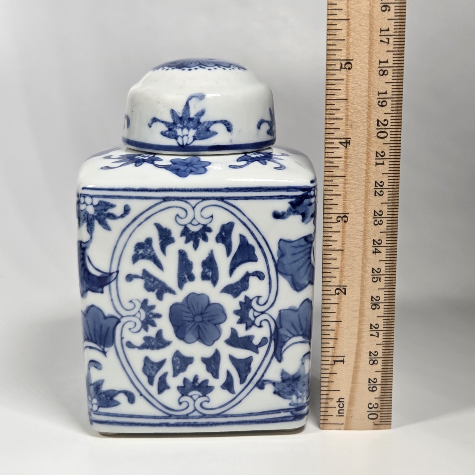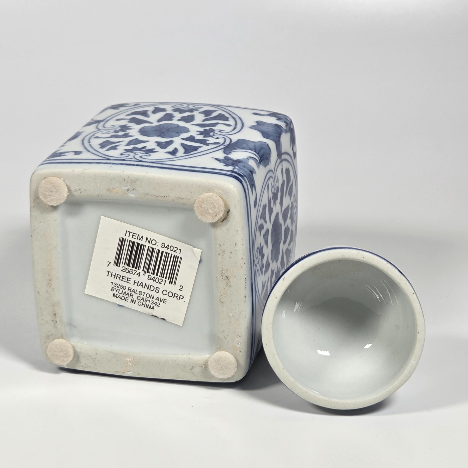 Preowned Chinese porcelain blue & white loose tea jar with lid imported by Three Hands Corp. The underside has the original Three Hands Corp label affixed above the Chinese mark that is stamped under the glaze. The jar measures 5" H x 3-1/8" W x 3-1/8" D. There are four white felt protector dots affixed to the underside corners as shown in the listing photos.CONDITION: GOOD PREOWNED USED CONDITION WITH A SMALL RUB IN THE GLAZE ON ONE FLOWER PETAL ON THE LID AS SHOWN IN THE LISTING PHOTOS. Please feel free to contact us as we appreciate all communication with shoppers. We will combine multiple item orders for shipment, so please wait for our invoice with the recalculated freight. If you like our shop, click onto the Save Seller ❤️ at our store making it easy for you to pop into our shop anytime with a click of your mouse!
