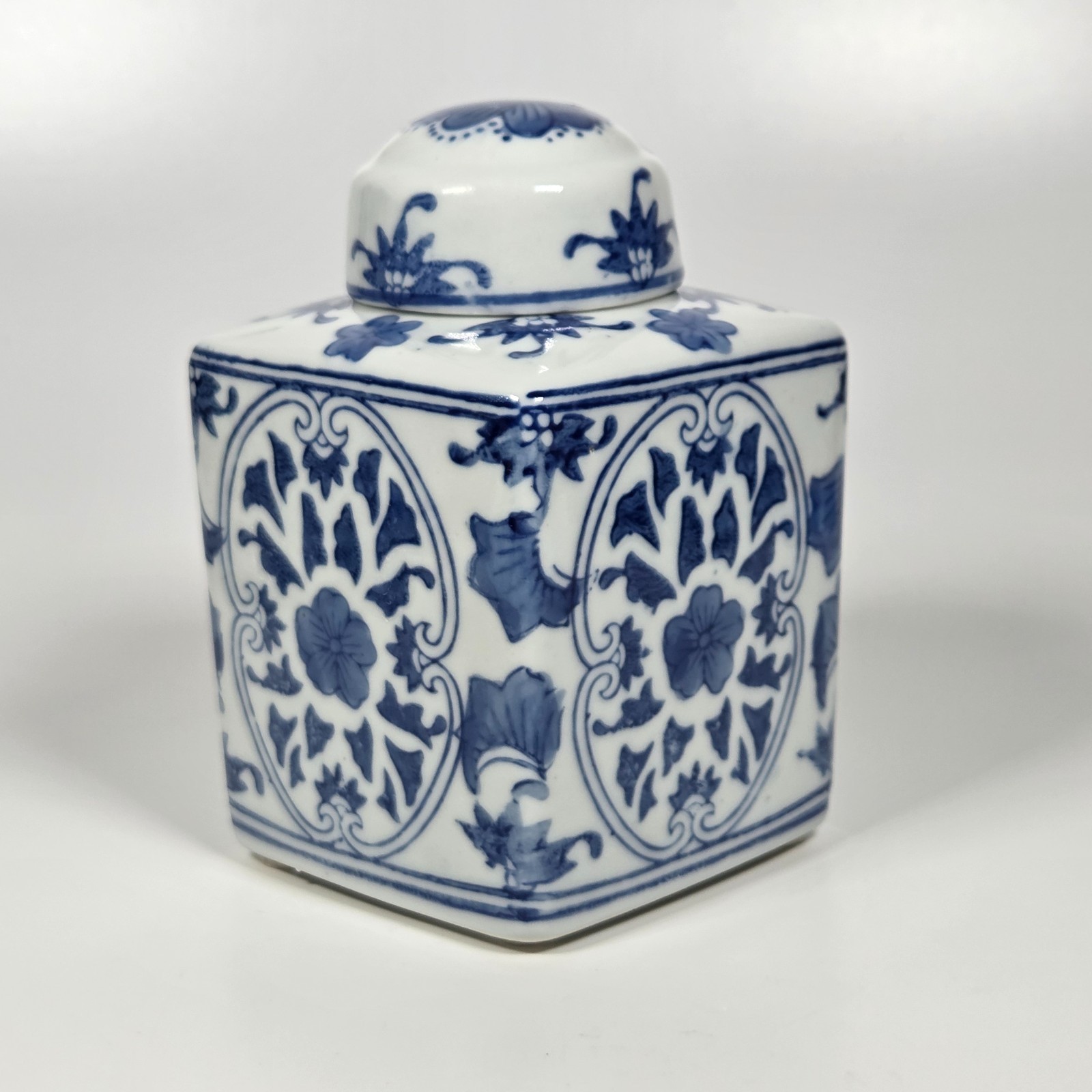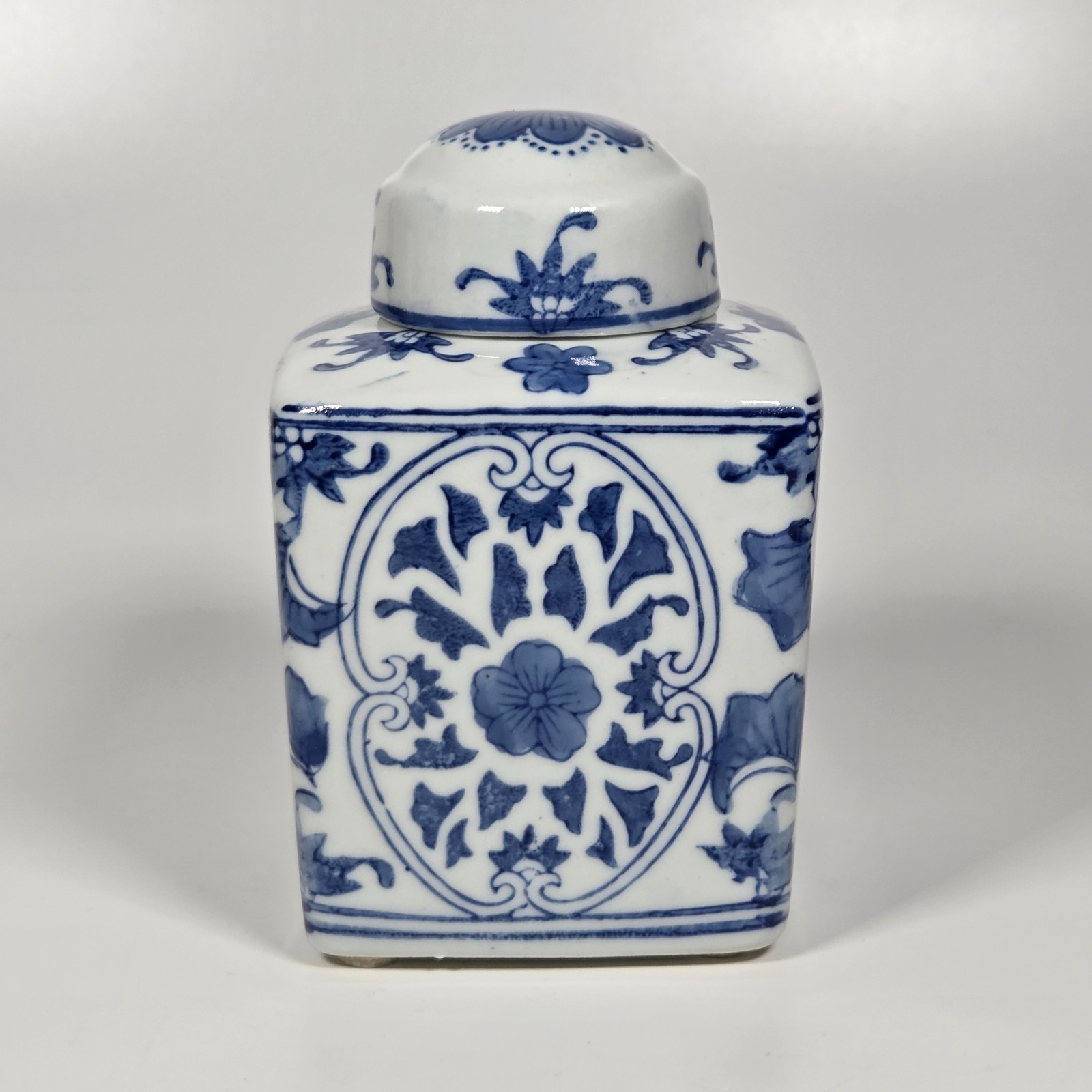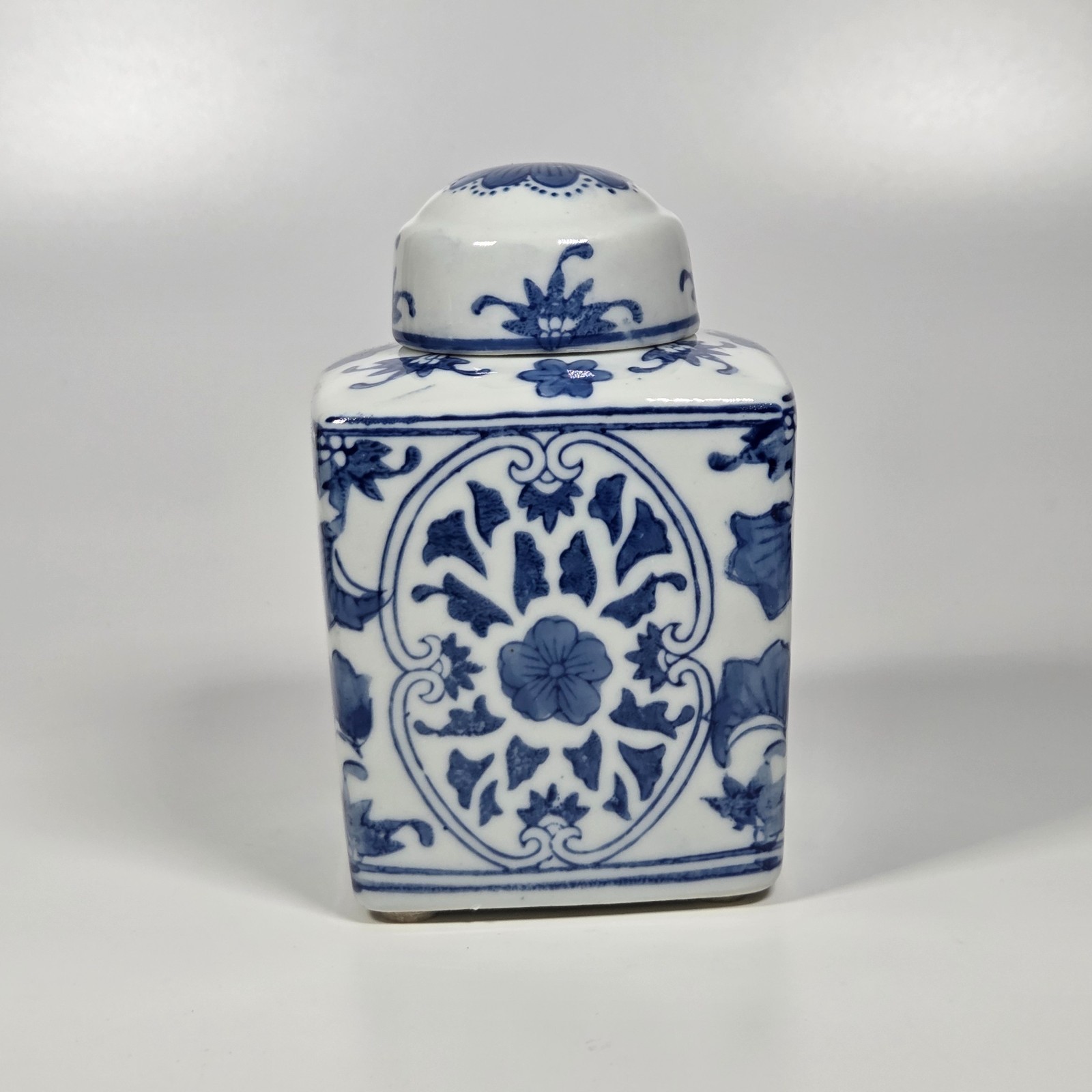 These 3-Hand Corp. Chinese blue and white porcelain tea jars with lid are a collectible decor and storage piece for tea or small items. Condition is good preowned used, with a small rub in the glaze on one flower petal on the lid as shown in the listing photos. Free shipping is included. Check the listing for details, including what is included, measurements, and any additional wear visible in the photos.