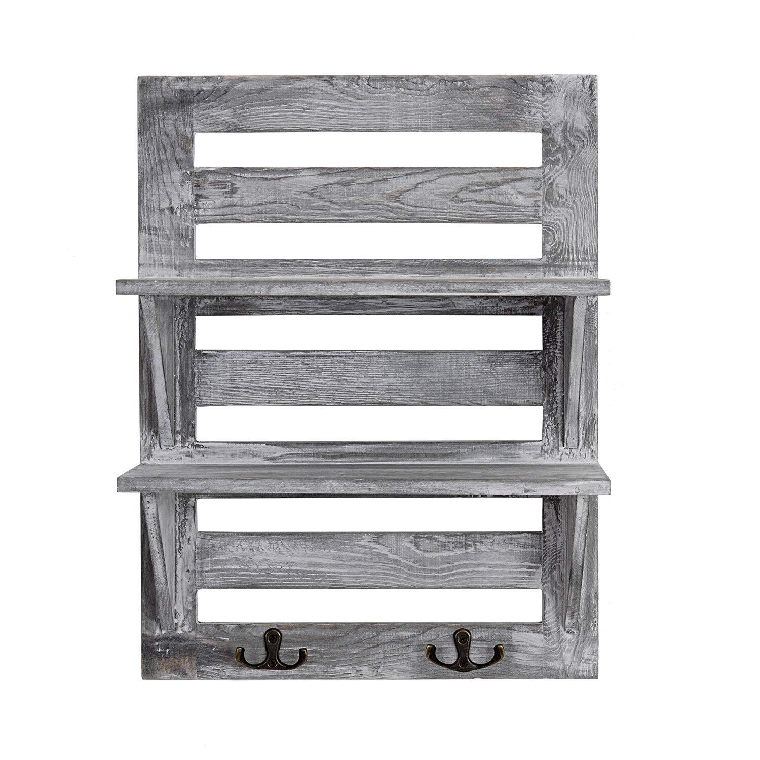 VERGOODR Rustic Wooden Wall Mounted Organizer Shelves with 2 Hooks, 2-Tier Storage Rack, Decorative Wall Shelf Organizer,Kitchen,Bathroom,livingroom Farmhouse Rustic Décor,Grey (Grayish white) Wood Home Decor:A beautiful and design-oriented multi-purpose rack for home decoration or basic daily necessities.2-tier shelves allows you to store photo frames, flowers or any decorative items, and the two double hooks at the bottom allow you to hang scarves, hats, keys and more. Versatile design: suitable for storage in the living room, kitchen, bathroom or office. You can hang key rings/hats/scarves/coats, etc. You can also place and display smaller photo frames, small ornaments, figurines, artwork, crafts, use as kitchen spice racks, and even store potted plants, succulents and more. Decorative