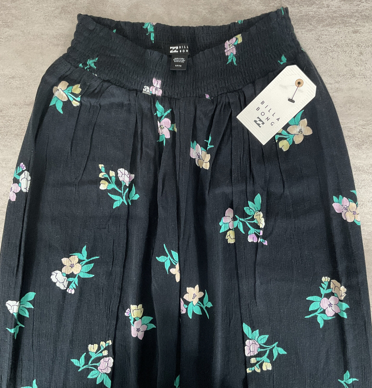Billabong Wandering Soul Black Floral Split Leg Pants Women's Size Small NWT.Elastic waist band for comfort. Soft flowy material.B13