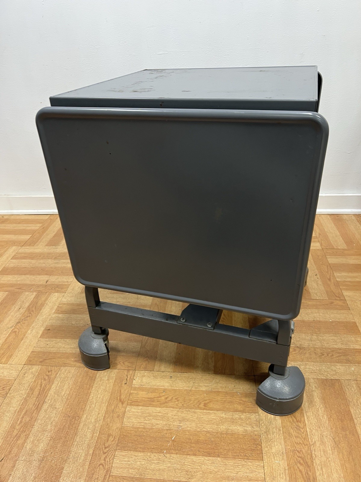 Vintage metal typewriter table.Rolls well. The leaves lock into place easily. Original gray paint has some light surface wear (light scratches on top). Sits flat and flush. Clean piece. Strong, sturdy steel. Wheels are able to lock down in place. Measures approx 20" deep x 26" tall x 20" long (50 1/2" long with both leaves up in place). Made by Tiffany (has remnants of label). ref 30188.