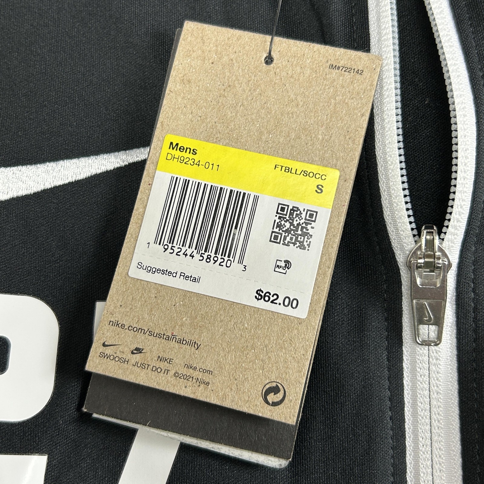 Brand New with Tags. Pacific Northwest Soccer Club logo100% polyester construction for lightweight comfortFeatures Nike Swoosh, "27" on chest, and prominent PNW soccer badge with Space Needle and soccer ball embroideryDri-Fit material for moisture-wicking performance, ideal for training and casual wearSlim Fit silhouette for modern athletic lookTag size: Small (Mens); style code: DH9234-011; retail: $62Full zip front with white zipper and zippered hand pocketsMain colors: black body with gray sleeves and shoulders, black cuffs and hemMeasurements (approximate, shown in photos): pit to pit ~19.5", length ~27"Made in Sri LankaRecommended gentle machine wash cold, avoid softeners, do not iron decoration