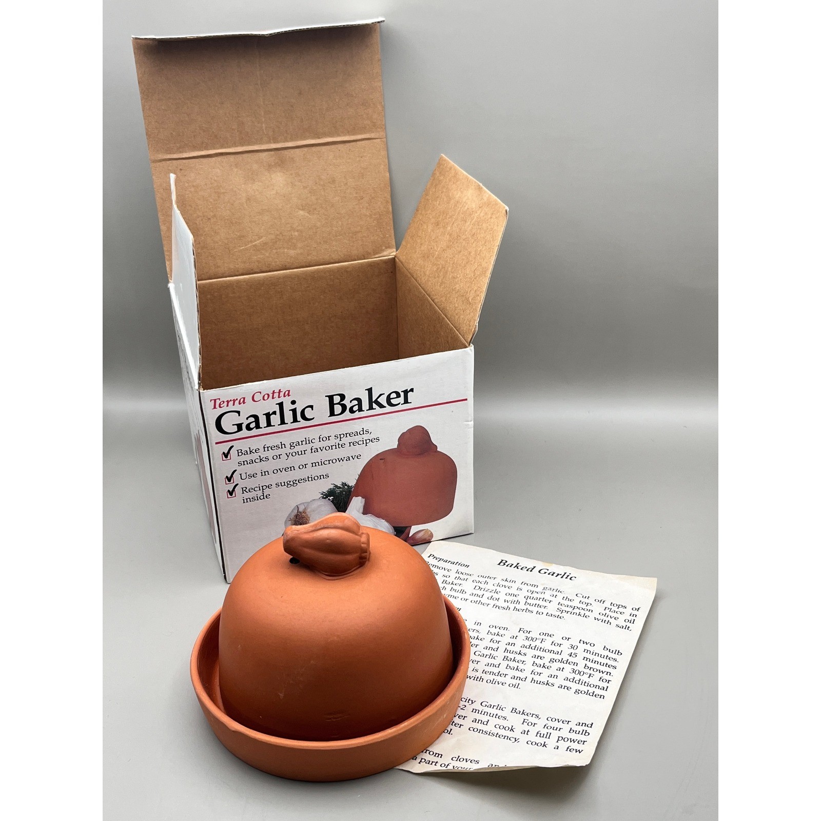 The Vintage Corning Revere Terra Cotta Garlic Baker is a made of terracotta. In original box. No chips or cracks.I want to ensure you have the best shopping experience possible! Please take a moment to carefully review all photos before making your purchase. This will help ensure you know exactly what you're receiving and that it meets your expectations. If you have any questions, feel free to reach out—I'm happy to help!
