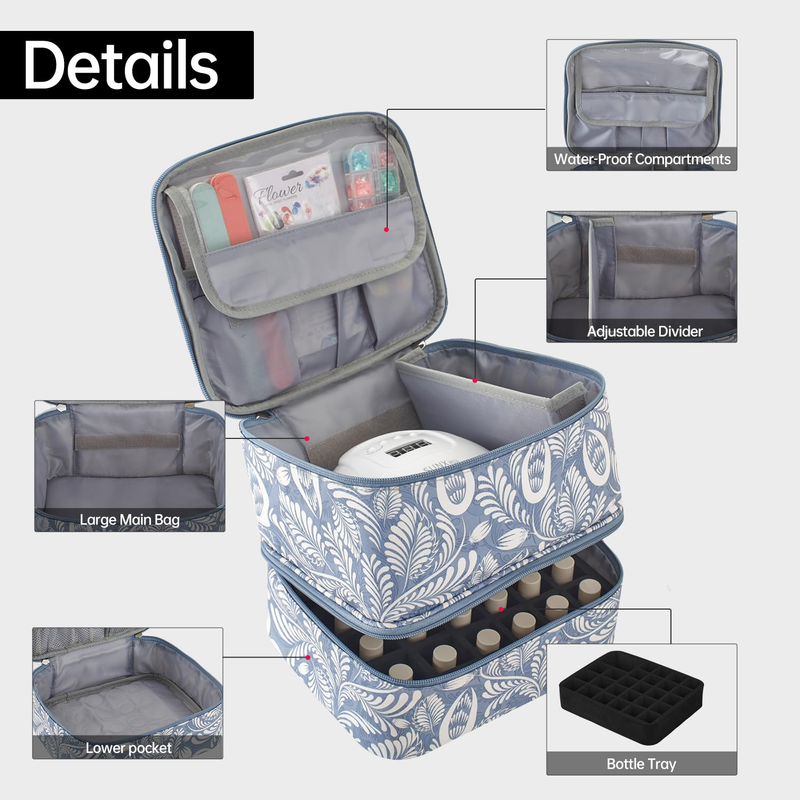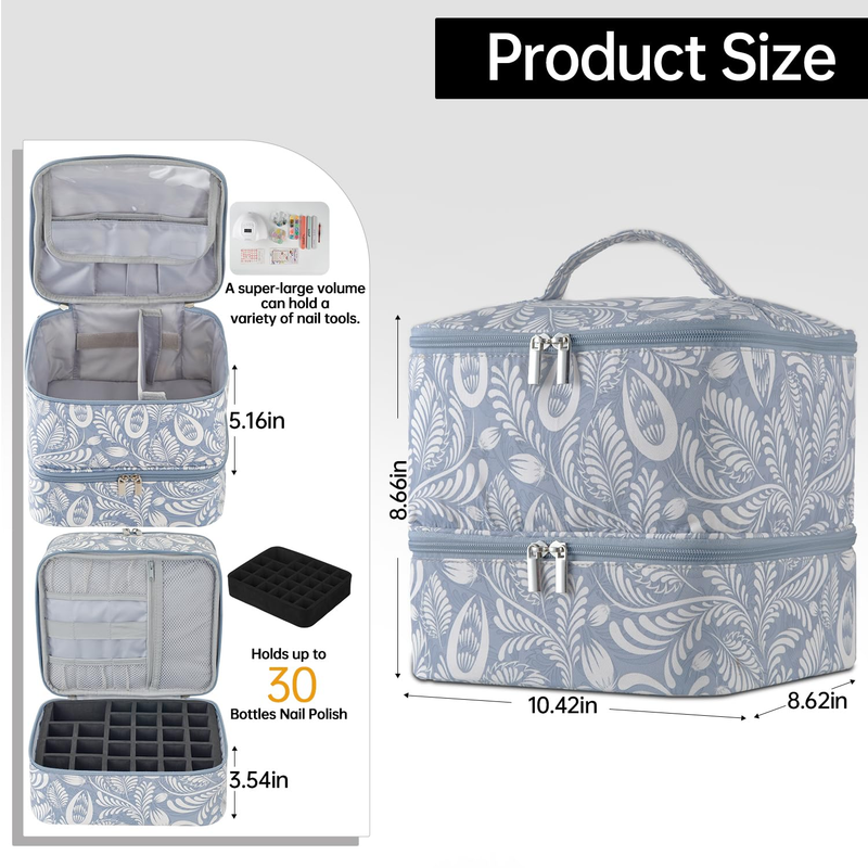 Store New Arrivals Add to Favorite View Feedback ContactNail Polish Organizer, Double-Layer Nail Tools Nail Dryer Case, Holds 27 Various Size Bottles (15Ml - 0.5 Fl.Oz or Larger), Nail Polish Carrying Case with Adjustable Dividers(Light Blue Leaf)Description Item dimensions L x W x H 10.24 x 8 x 8 inches Special Feature Includes Card Holders Color Light Blue Leaf Item Form Bag Product Dimensions 10.24 x 8 x 8 inches; 12.63 ounces Country of Origin China