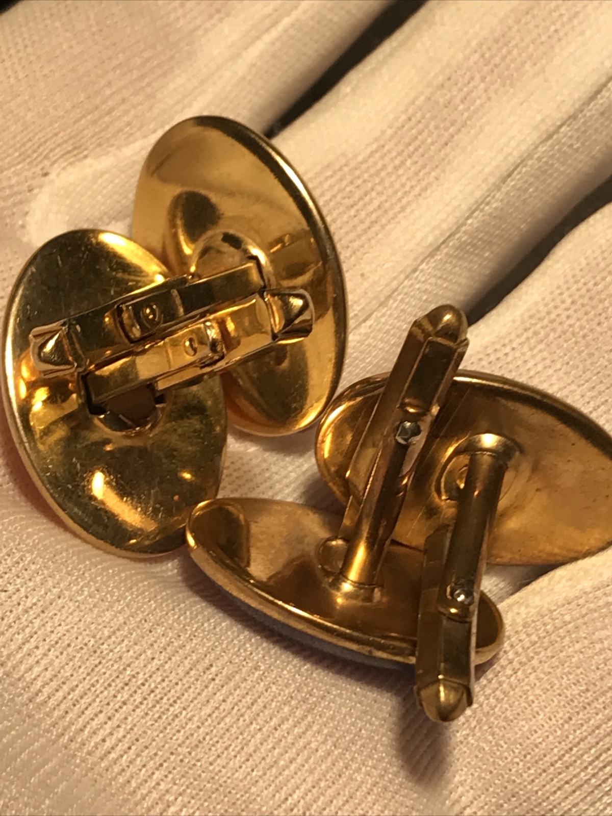 VTG Oval 1” X 3/4” Cuff Links Faux Amber & Faux Lapis/Opalescent Gold Tone. Both are wearable - both show sign of wear when looking closely. The faux amber cuff links have fine crackle lines. Both have very fine scratches and minor tarnish. They measure approximately 1” x 3/4” each. Photos are part of the description and actual item you will receive. Please ask all questions prior to purchase as there are no returns.