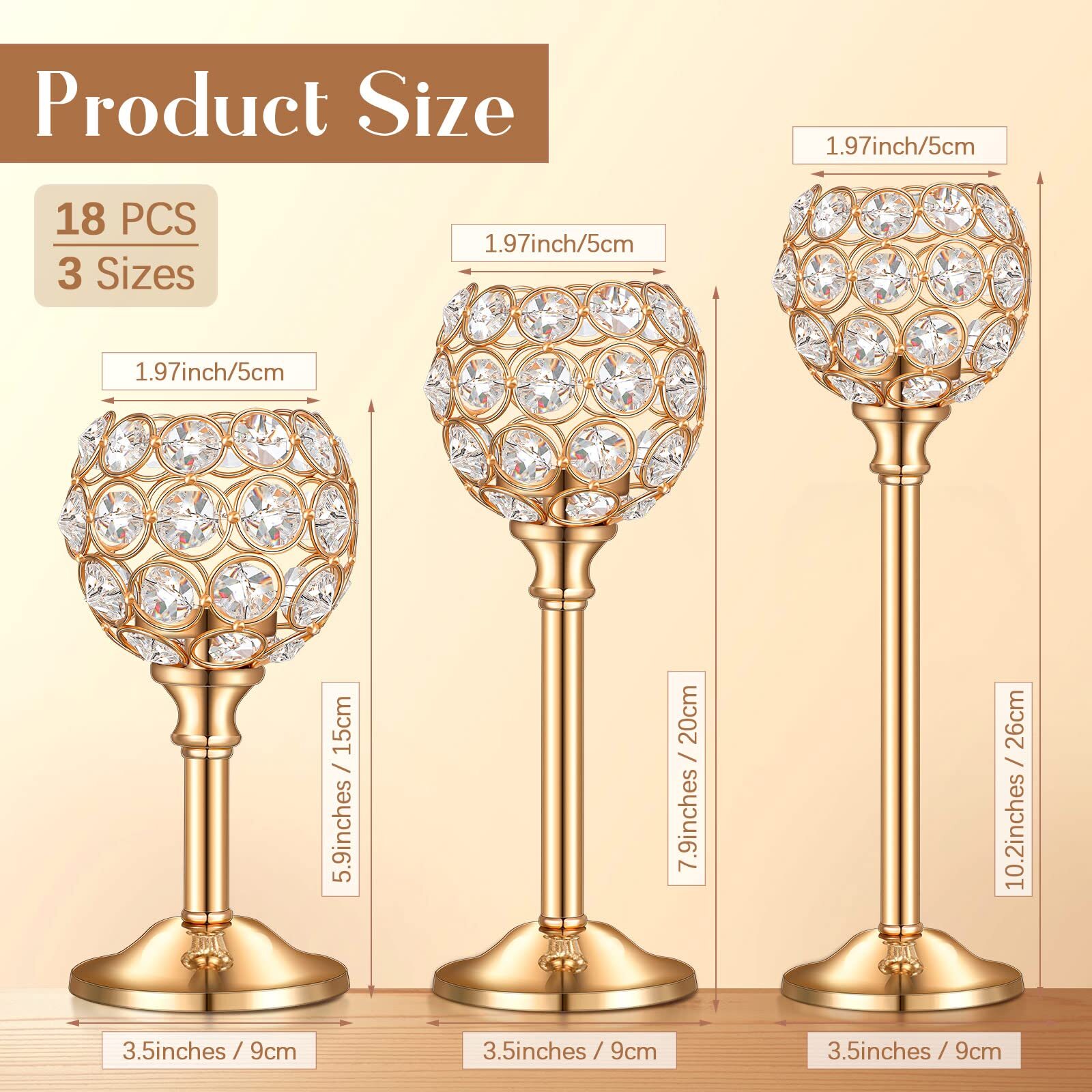 Qunclay 18 Pieces Crystal Candle Holders Bulk Candle Stick Holder Centerpieces for Table Wedding Centerpieces Crystal Decorative Tealight Candle Dining Table Candle Holder Decor for Party (Gold) Centerpieces for Tables Set: you will receive 18 pieces of crystal candle holders in 3 sizes, 6 pieces of each size; The quantity is sufficient to meet your decorative needs for table or party decorations Detail Sizes: these gold candle holders are about 5.9 x 3.5 inches/ 15 x 9 cm, 7.9 x 3.5 inches/ 20 x 9 cm and 10.2 x 3.5 inches/ 26 x 9 cm, so you can choose the sizes according to your needs, making your candles more elegant Delicate and Exquisite Look: the candle centerpieces for tables feature hollow design delivers a sense of dignity with freshness; With its good stylish and elegant expression of the special passion and artistic taste Reliable and Sturdy Material: centerpiece table decorations are made of quality plated, through die casting, grinding, polishing and electroplating to strengthen the anti corrosion, many technological processes strengthen the property of anti-corrosion and rust prevention and present the superb production process Wide Applications: table candles centerpiece is suitable for romantic candlelit banquet, party, table centerpieces, fireplace, wedding, home decoration, engagement, anniversaries, Christmas, Mother's Day or any other holidays and events Features: Applied in other places: Dining table decor centerpiece is suitable for various flat surface, such as dining table, coffee table, fireplace, counter, ground carpet, office desk and more Simple to use: Just put the ordinary candles or LED flameless lights into gold candle holders, the lights reflected bling bling from the crystals, you can also add some beautiful flower bouquets, to create a romantic and sweet atmosphere Specifications: Material: crystal and metal frame Color: gold Size: about 5.9 x 3.5 inches/ 15 x 9 cm, 7.9 x 3.5 inches/ 20 x 9 cm and 10.2 x 3.5 inches/ 26 x 9 cm Package includes: 18 x Glass candle holders for pillar candles Notes: Manual measurement, please allow slight errors on size. The