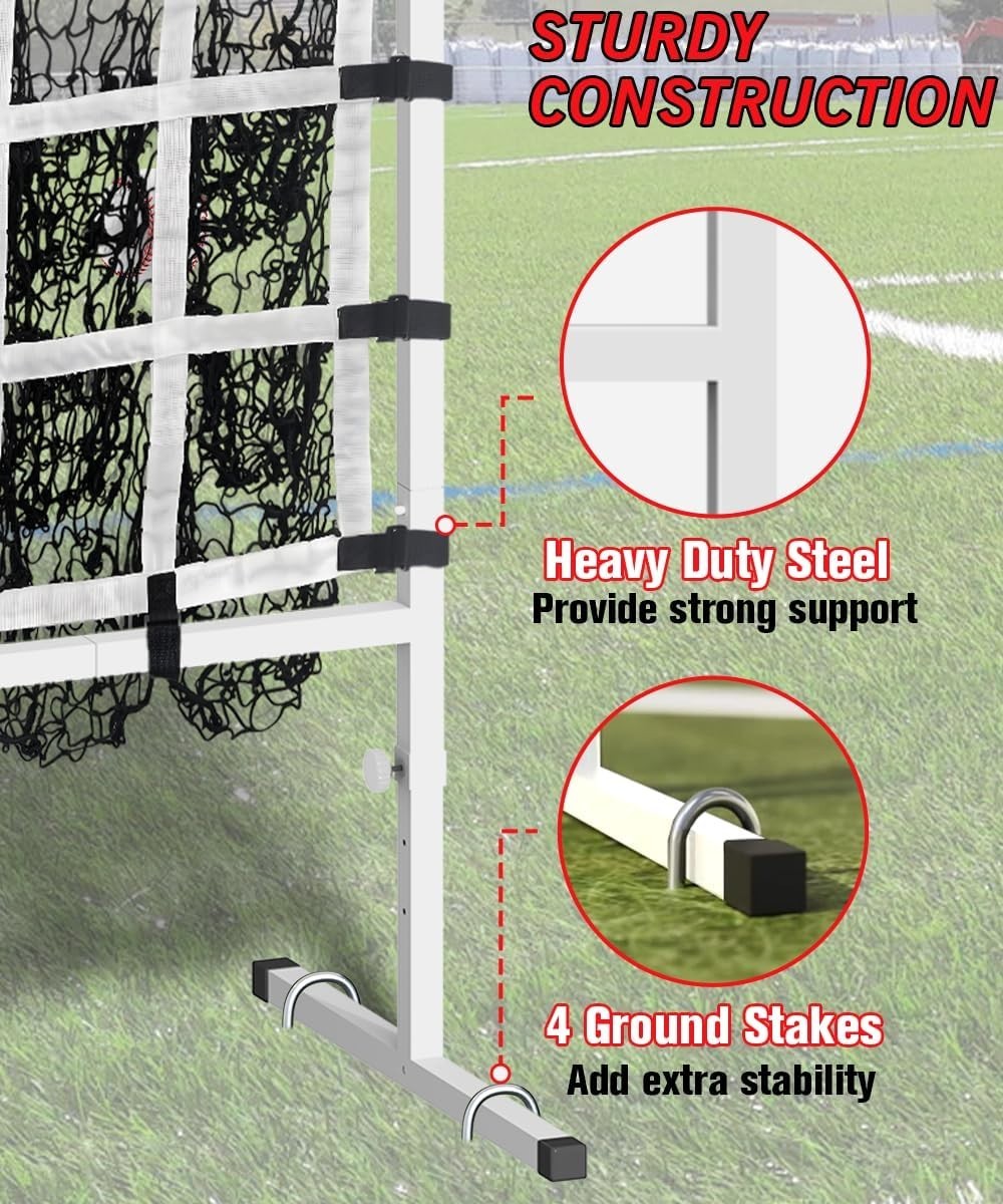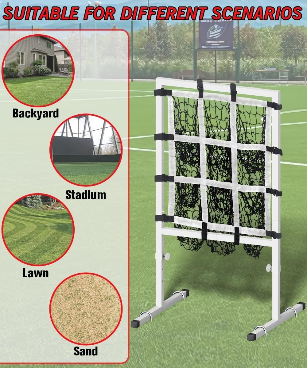 About this item 🎯 9 Pitching Targets: Features 9 individual strike zones that help improve pitching accuracy, mechanics, and muscle memory. Perfect for baseball and softball players of all ages to train independently—no partner required. 💪 Premium 6-Ply Net: Crafted from tear-resistant, knotless 1.75” Dacron Terylene, double-stitched for maximum durability. This 6-layer net can withstand high-speed pitches and hits without fraying or tearing. ⚾ Adjustable Height Levels: Offers three height settings (41", 44", 48"), allowing players to customize their training for different skill levels and sports—including baseball, softball, and field hockey. 🧱 Heavy-Duty Steel Frame: Built with a sturdy powder-coated steel structure that resists rust and impact damage. Includes 4 ground stakes for superior stability during intense training sessions. 🌦️ Weather-Resistant Design: Powder-coated surface ensures long-lasting outdoor use, maintaining strength and reliability in various weather conditions.