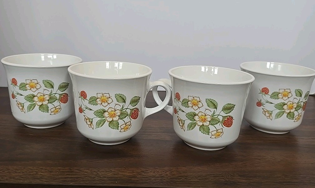 This set of 4 vintage Corelle Corning coffee/tea cups/mugs in Strawberry Sundae features a classic round shape with a glossy white finish and a decorative Strawberry pattern. Made in America, these machine washable mugs are stackable, break and chip resistant, and dishwasher safe. With a pressed glass production style and a fused glass technique, these original vintage cups are perfect for all occasions and suitable for both men and women. The colorful floral and fruit-themed mugs are a charming addition to any home decor.