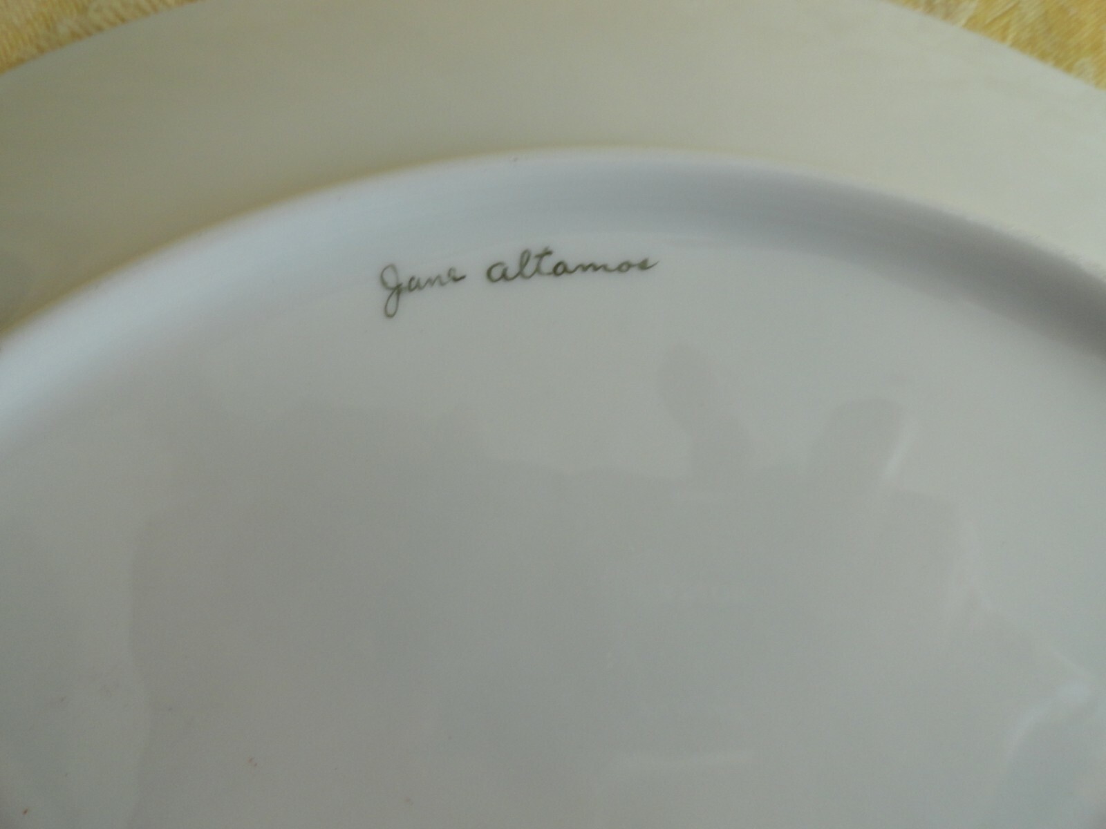 Vintage Porcelain Handled Serving Tray 12" SignedMeasures approx. 12" from handle to handle, 10 3/4" diameter, 1 1/8" tall very good used condition, a few wears on gold gilt, a dent at edge see last photo.Please view all pictures carefully as they serve as part of the description. If there acquisition is anything I can do to make this a great for you, please let me know. My goal is a happy customer which shows up by a 5 star feedback from you.If you feel you can not leave me positive feedback and a 5 star rating in all categories, please contact me for a happy resolution. I am very easy to work with. Returns are accepted within 30 days, buyer pays for return shipping unless I have made an error in the listing. CHECK OUT THE OTHER ITEMS I HAVE LISTED. WE WILL COMBINE SHIPPING IF POSSIBLE to save you money. If you purchase multiple items, please wait for an invoice to be sent out, as sometimes Ebay does not calculate the cost accurately. Thank you and have fun bidding! !