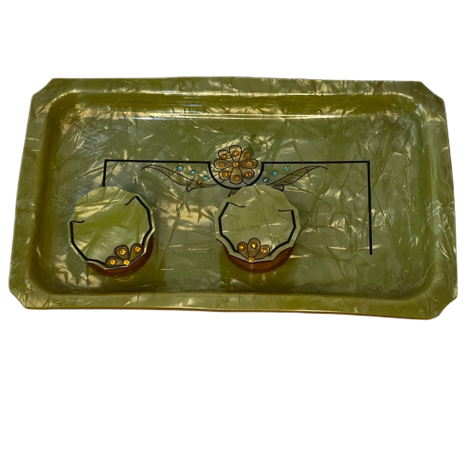 Antique Celluloid Vanity Manicure Tray Set, Green Brown Jeweled