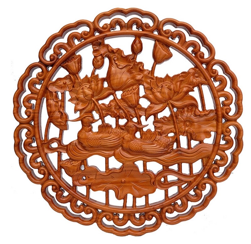 Chinese Feng Shui Peach Wood Plaque with Mandarin Ducks Bedroom Hanging