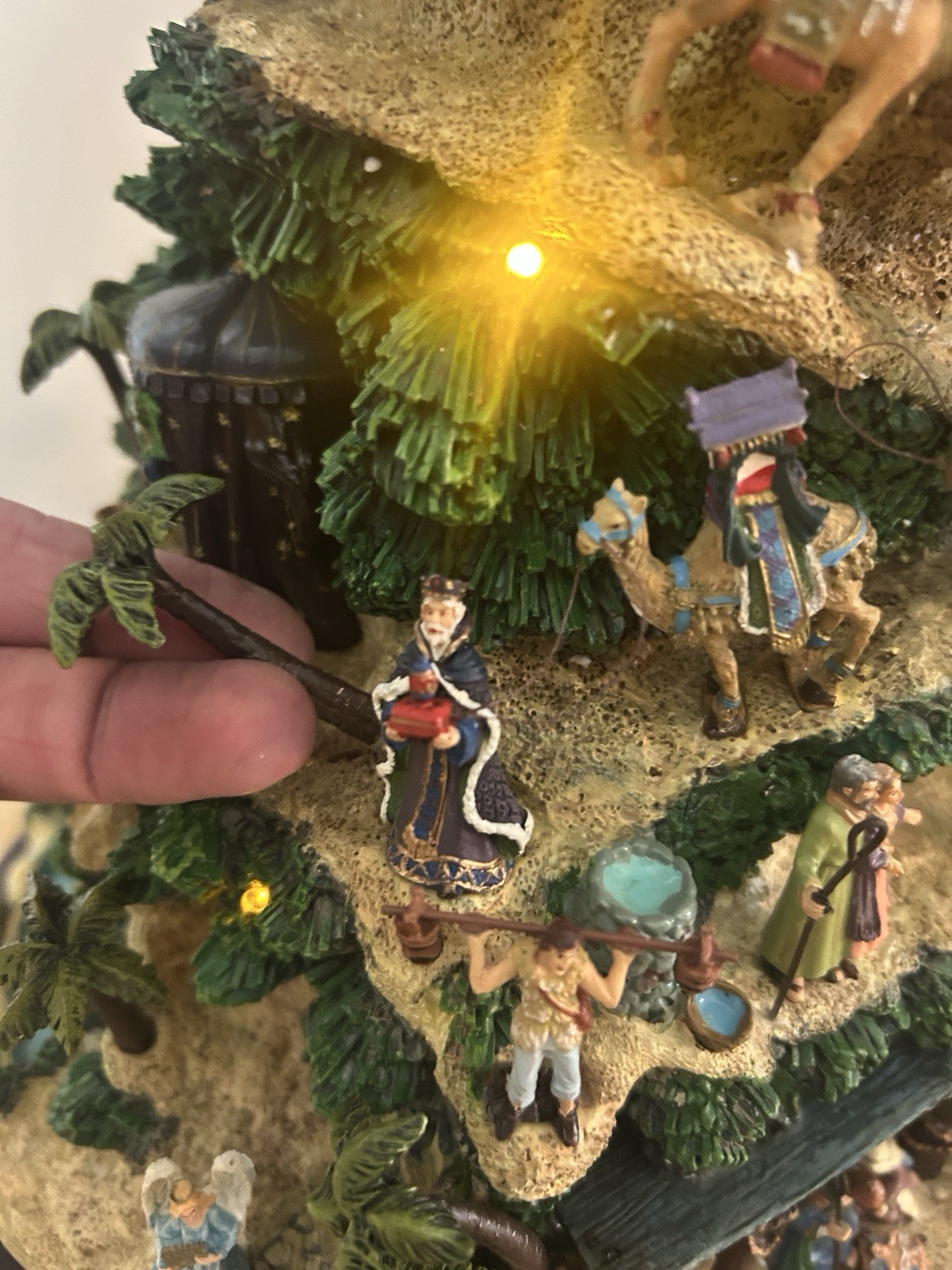 Thomas Kinkade Illuminated Nativity Tabletop Christmas Tree Glory to The Newborn KingOne palm tree has fallen off of it's base. Tree is taped inside box. The whole tree has come off of the base, it does not affect it working, but it will need to be glued back on. I am leaving that to the buyer to make sure it is the way YOU want it. Please take a careful look at the pictures, they are a very important part of the condition description.Sorry, I do not do local pick ups. I try to price my items fairly as Buy It Now. I do not respond to most offers. Please read the below section, you are agreeing to all terms by purchasing from me. Shipping/Handling: I will ship within 3 business days of payment. I try to offer the least expensive shipping service possible. In many cases Priority Shipping is less expensive than Parcel Select. I also offer more than one shipping service on many of my items. eBay only lists the first service in the listing, click on the Shipping and Payments tab under the pictures to see if I offer other services that may be less expensive. I do reserve the right to change the shipping service (USPS/FedEx) after item is packed and ready to ship. Shipping time will always be comparable. I will ONLY ship to the address you used at the time of purchase. If you need to change the address I will cancel the sale and you will need to re-purchase the item. I will not change the address you have entered. If you have special packing instructions, please contact me prior to making the purchase to make sure I can accommodate you. International ShippingAll shipping outside the U.S. is handled by the eBay Global Shipping program. eBay handles the international leg of the shipment. I do not see nor can a I control the shipping cost for international shipment. If your item arrives damaged or there is an issue you will need to contact eBay for a resolution. You will need to call eBay for assistance. By making a purchase on this item you agree to follow these terms.Combined Shipping:If you purchase multiple items from me I would be happy to combine shipping whenever possible. Sometimes due to weight or