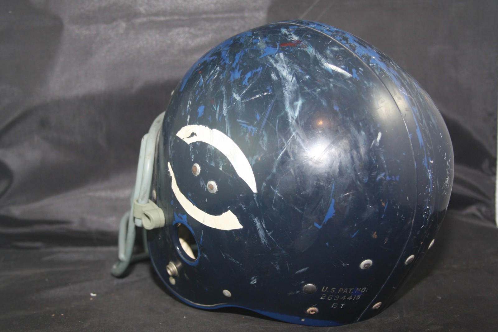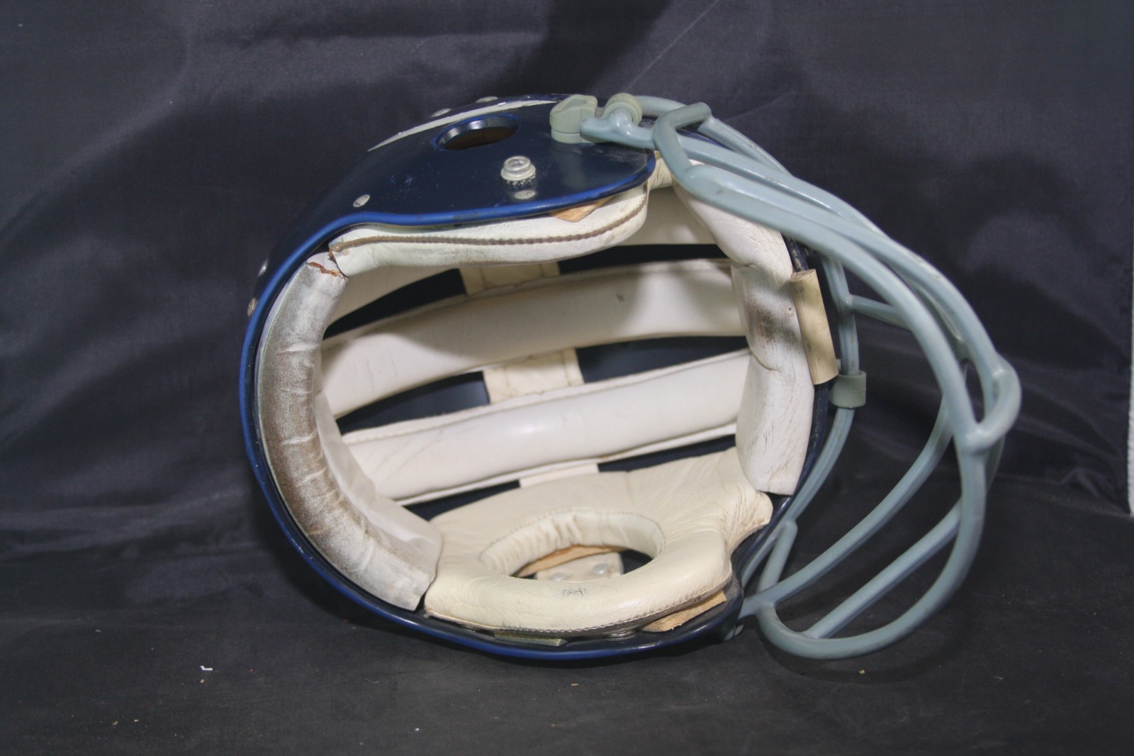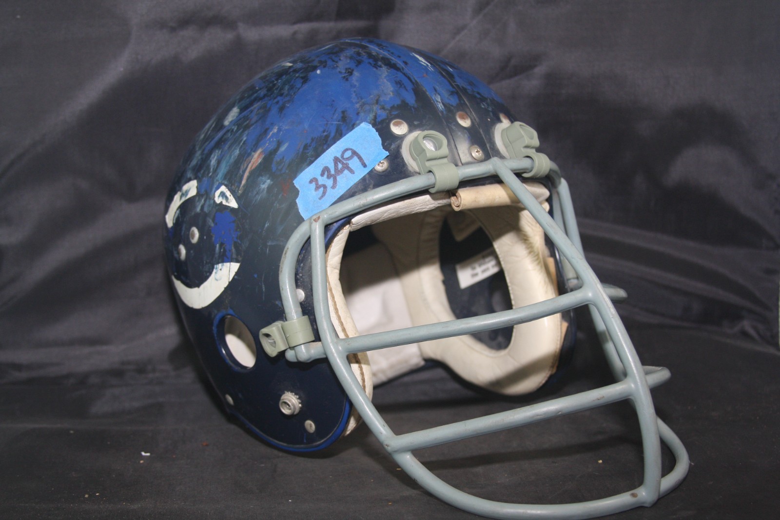 1969 Wilson F2000 Chicago Bears Game Worn Used football helmet. The helmet is complete and original as sourced to us with no modifications or alterations of any kind and shows extreme game wear to the exterior and logo decals. The helmet does not have any player identifiers inside the shell so we have not been able to attribute it to a specific player. With the extreme wear and lack of identifiers, it is possible that after seasons of game use it was relegated to a practice helmet. The Wilson rare F2000 model helmet is all original and complete with the interior leather suspension padding. The helmet has what can be described as the most beautiful 1960s clip on, thin wire original NJOP model facemask that we have ever seen! Simply Beautiful. The Bears under owner and Head Coach George Halas used almost exclusively Wilson helmets. Halas was on the Wilson Board of Directors, but also felt that the padding that the Wilson helmets had provided better protection to his players than the Riddell suspension helmets offered. The above mentioned mask is secured to the helmet using reproduction Schutt clips but retains what we assume to be the original hardware. When we purchased the helmet, the original clips were long gone and the mask was secured to the helmet with modern Schutt clips but without the modern Schutt hardware. It appears that the original owner wanted to reattach the loose mask to the helmet but knew enough to reuse the original hardware to do so. The helmet's interior is very nice and contains the original F2000 leather jaw pads, which also were incorporated into the helmet's lateral protection. . The helmet is painted Chicago Bear dark navy over a royal shell as often the case during this era. The helmet is in very nice , awesome display condition with heavy game/practice wear with paint and mask transfers and extreme paint loss to the shell exterior. The logos of the helmet are in well worn condition and what remains of them are adhered to the helmet well with no lifting. Nice very rare gamer with a very rare beautiful facemask, from the Golden Age of Football, at a great price.