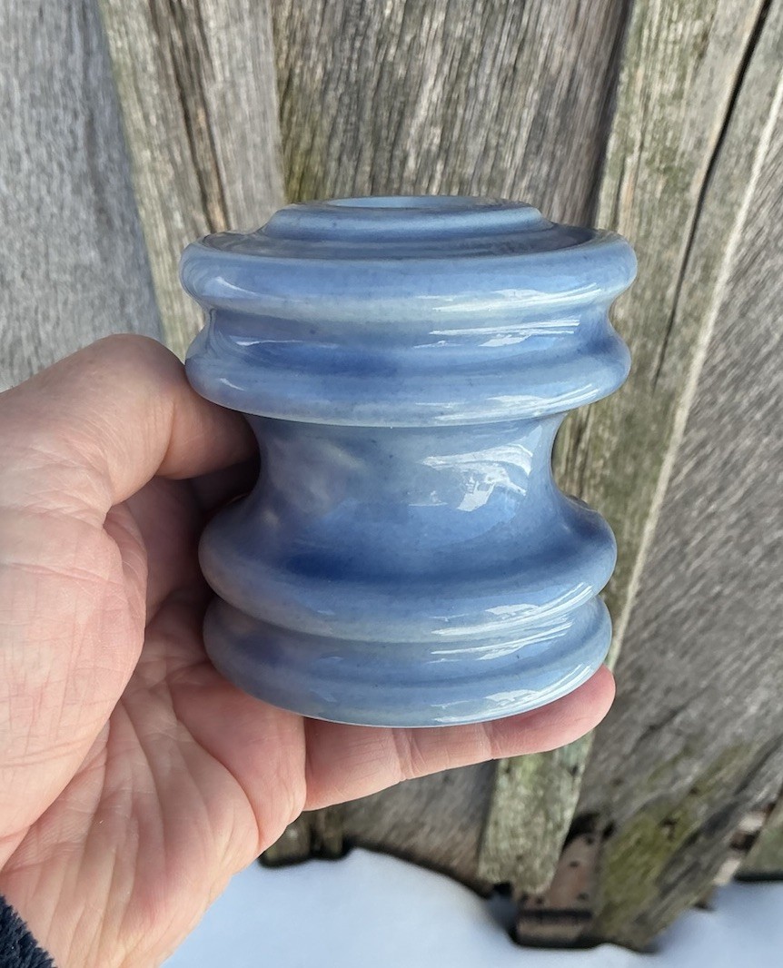 Beautiful rare drippy glaze cornflower blue with two tone antique glaze spool insulator made in the United States. It features a beautiful light blue