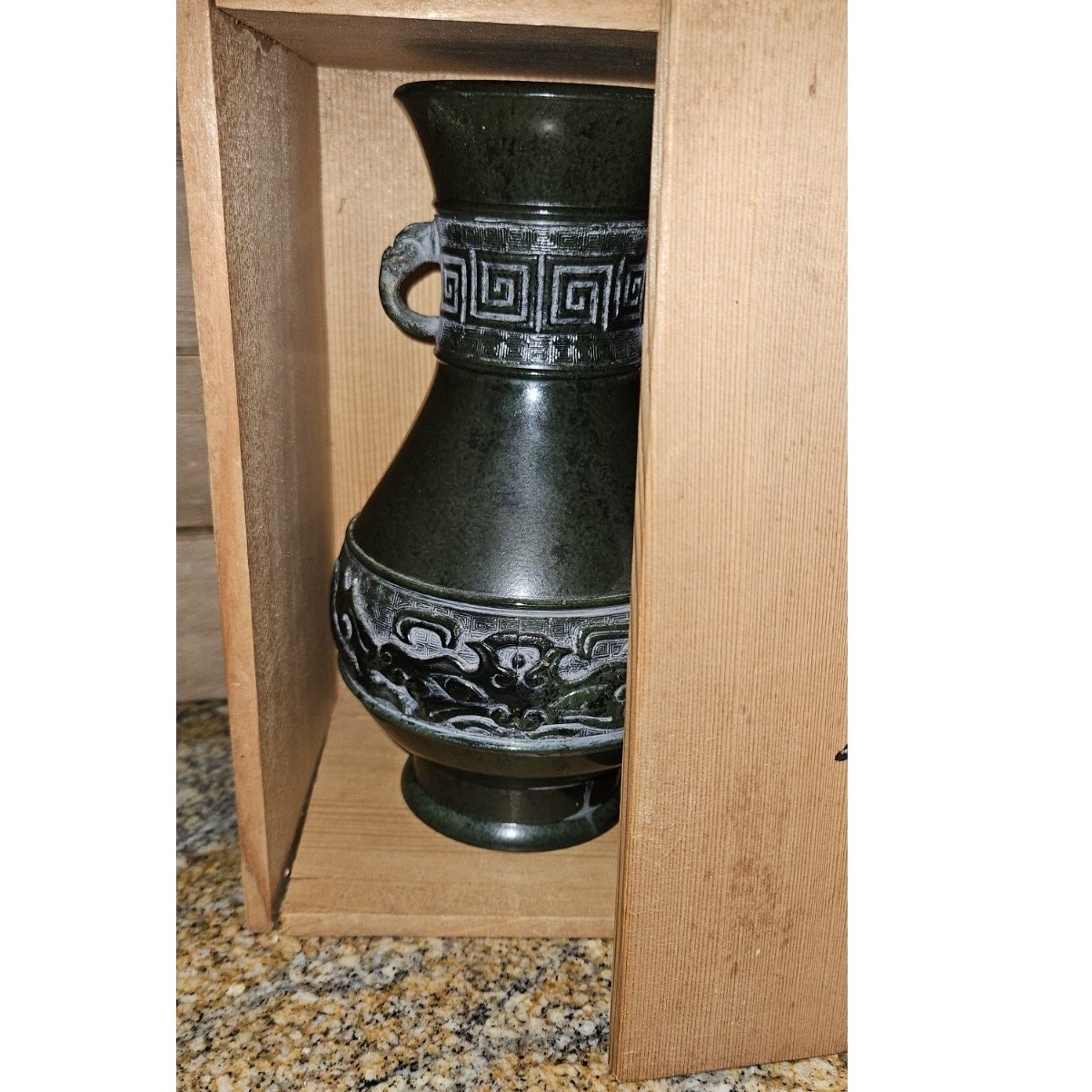 I am and AVID thrifter - This is not my full time job, more of a hobby -This is not my source of income so I will price as fairly as I can to move items-The thrill of the thrift drives me more than turning a dollar.Thank you for lookingVintage Chinese Malachite Vase - Measures approximately 7.25" tall x 4.25" wide. Green colored glaze (malachite) on either brass or bronze. Vase is heavyweight for size. Top portion of vase has a black, embossed, Greek key/meander design that wraps around vase with dragon handles on each side. Bottom band wrap around design has a Greek key background with raised dragons on each side. Vase is unmarked.