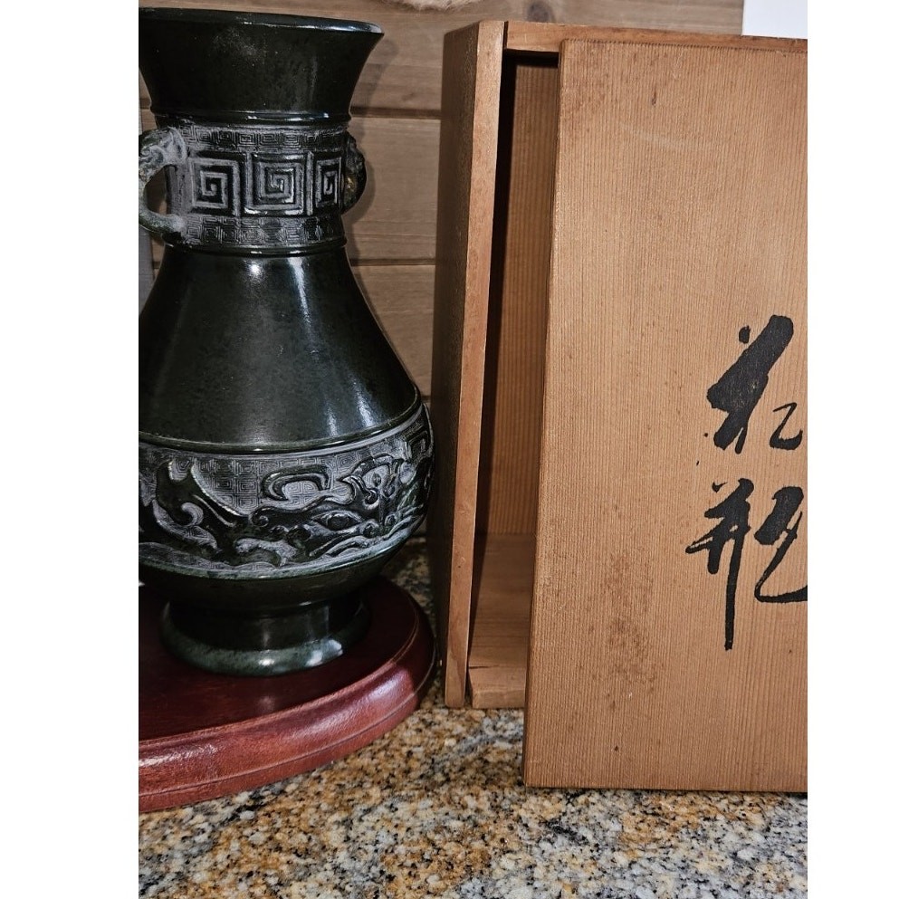 Vintage Bronze Chinese Vase with Dragon Handles, Original Box