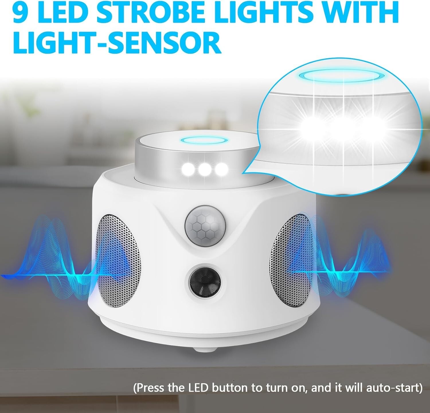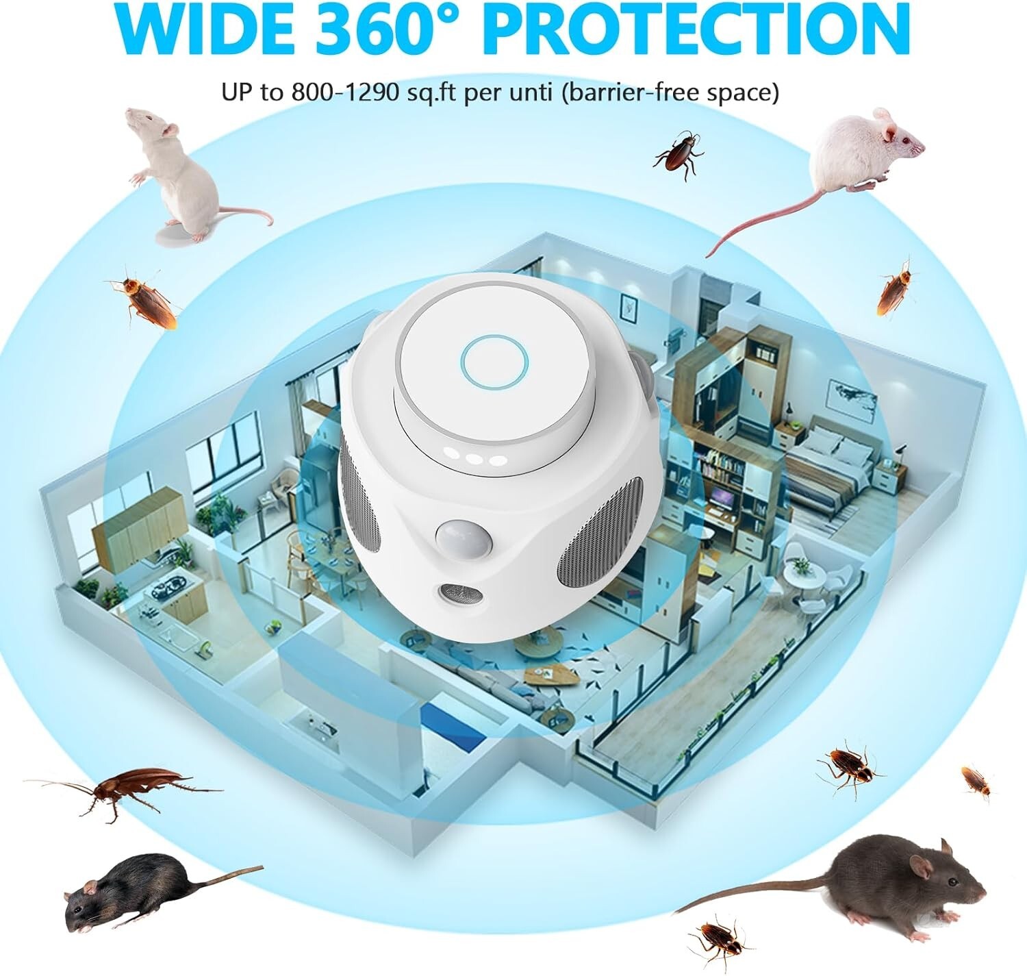 About this itemULTRASONIC MICE REPELLENT: The ultrasonic insect repeller emits high-frequency ultrasonic sounds and pulse waves in the 22-36KHZ range that disrupt the neurological systems of rodents, effectively causing discomfort and driving them away from your home, in a non-invasive and humane method, making your space inhospitable to pests like mice, rats, squirrels, and bats!3 EFFECTIVE REPELLING MODES: Equipped with cutting-edge microelectronics technology, the ultrasonic repeller for rodent indoor home offers three specific ultrasonic wave modes: ULTRA, TRANS, and DUO. The frequency wave generated by the mice repeller is intermittently changing, so it is difficult for mice to adapt to it and develop immunity. They are expertly designed to repel various pests efficiently.360 °INFRARED SENSOR & LED STROBE LIGHTS: The mice repellent indoor with three speakers emits powerful ultrasonic sounds and pulse waves that disrupt the brain system of those unwanted critters; With 9 LED flashing lights, the rodent deterrent device disturbs their activity in the dark, causing extreme irritation to rodents and pests, compelling them to flee from your home, car.SAFE AND EFFECTIVE SOLUTION: Our indoor ultrasonic rat repellent has no powder, no odor, and no noise, the high-frequency sound waves emitted by the device do not pose any harm to humans or pets, such as cats and dogs, making it a safe and effective solution for rodent ultrasonic repellent. Do not need to clean up dead pests, no bad smells and corpses!COMPACT DESIGN & WIDELY APPLICABLE: The rodent repellent plug in is effective within an indoor area of up to 1290 sq ft; It's widely applied in homes, attics, warehouses, offices, gardens, hotels, RV or any indoor place; We recommend that you install a bat deterrent devices in every room for better results.